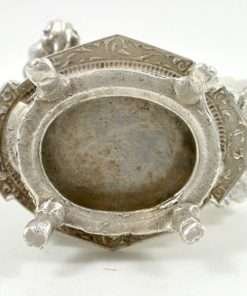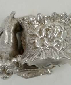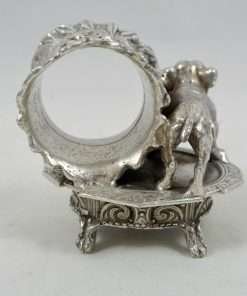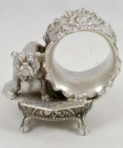 This absolutely exquisite napkin ring has an extraordinary amount of detailing! On one side there is a standing Bulldog, done so realistically, that you can see the folds of skin on his neck, and his furrowed brow! He is standing on an oval-shaped table that has four claw-footed legs and gorgeous scrollwork on both the table top and on its very ornate sides. Next to the Bulldog is a beautiful napkin ring with a leafy “ruffled” edge and large roses down the middle. The entire piece measures 2 1/2″ tall x 2 1/4″ wide x 1 3/4″ long and it is great condition with some minor scratches on the underside of the table base, and a small knick on the top inside of the napkin ring itself. Overall, this napkin ring is an amazing example of the figural napkin rings that graced the tables of Victorian families during the early 1900’s.