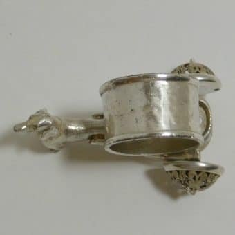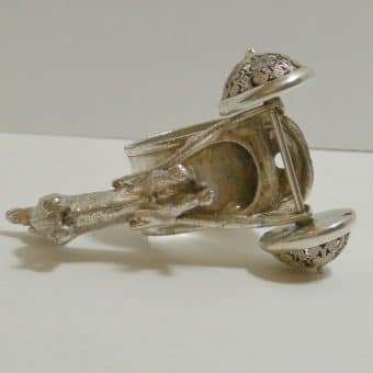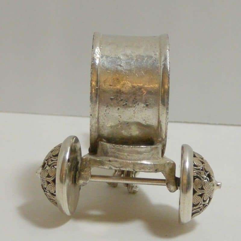 Measuring 2 1/2″ tall x 4″ long x 2 1/2″ wide, it has the highly-detailed Dachshund standing at the front of a flatbed wagon, that holds the napkin ring.