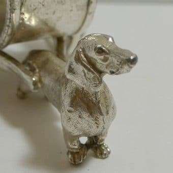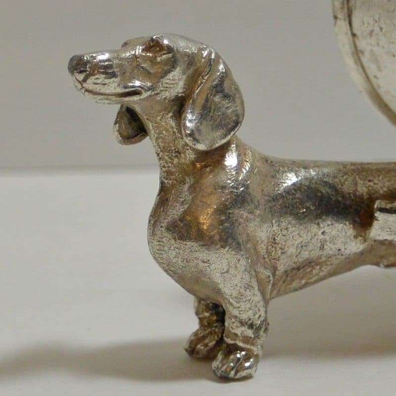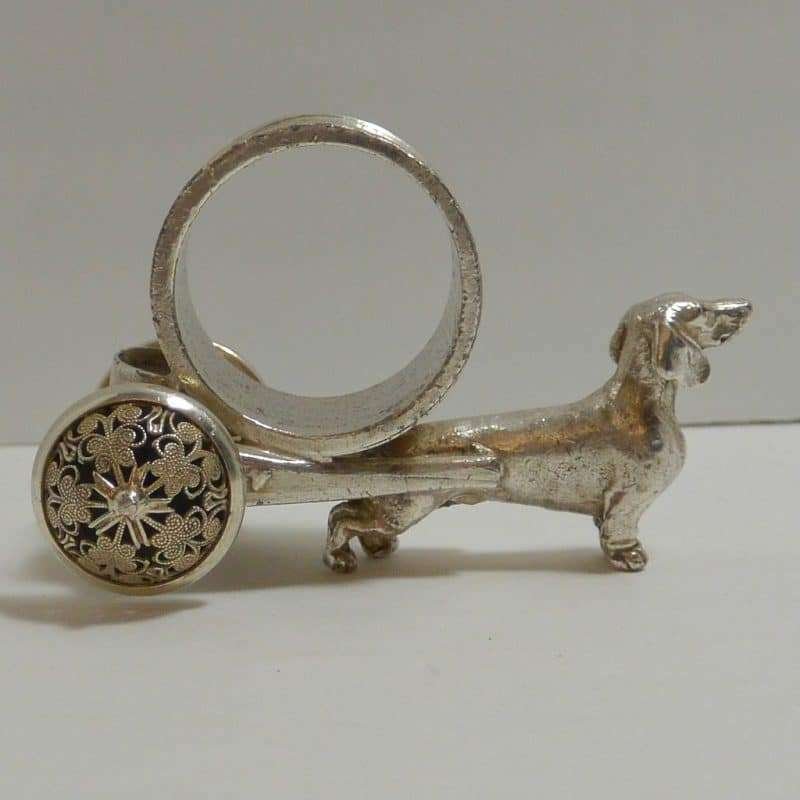 This gorgeous, silverplate, figural Dachshund dog napkin ring is so extraordinarily detailed, you will want to look at it from all sides.