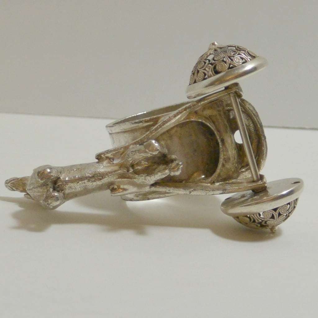 Measuring 2 1/2″ tall x 4″ long x 2 1/2″ wide, it has the highly-detailed Dachshund standing at the front of a flatbed wagon, that holds the napkin ring.