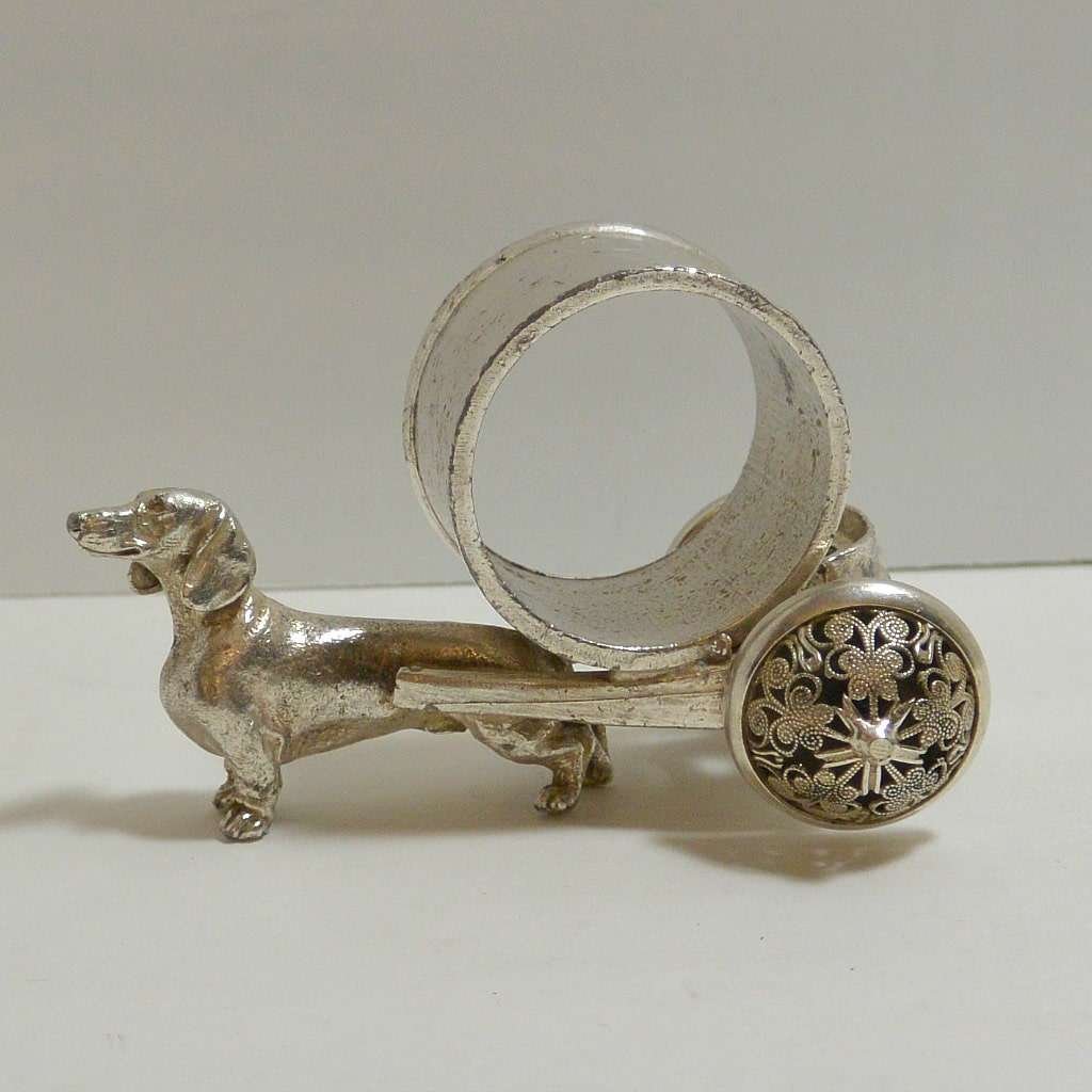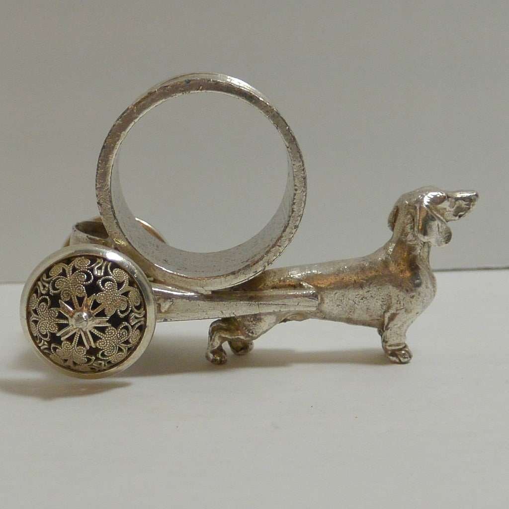 This gorgeous, silverplate, figural Dachshund dog napkin ring is so extraordinarily detailed, you will want to look at it from all sides.