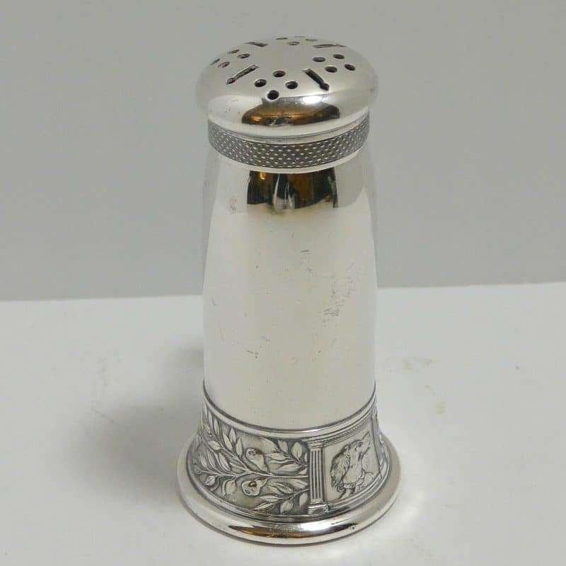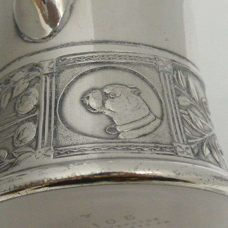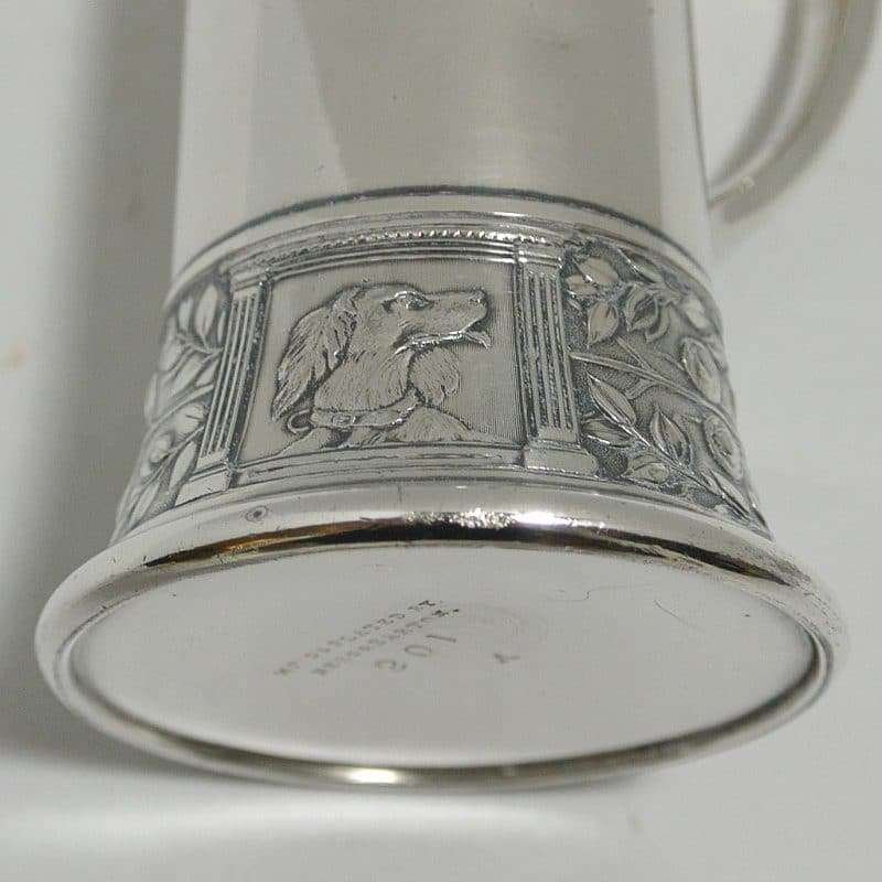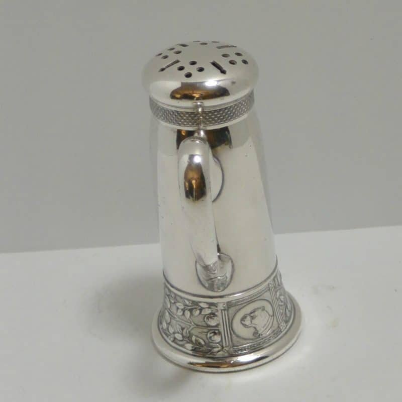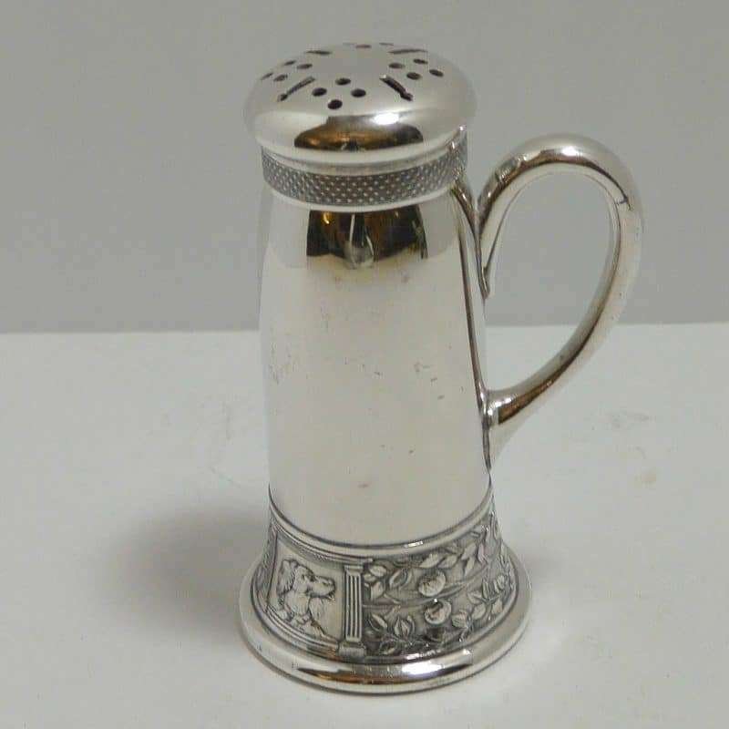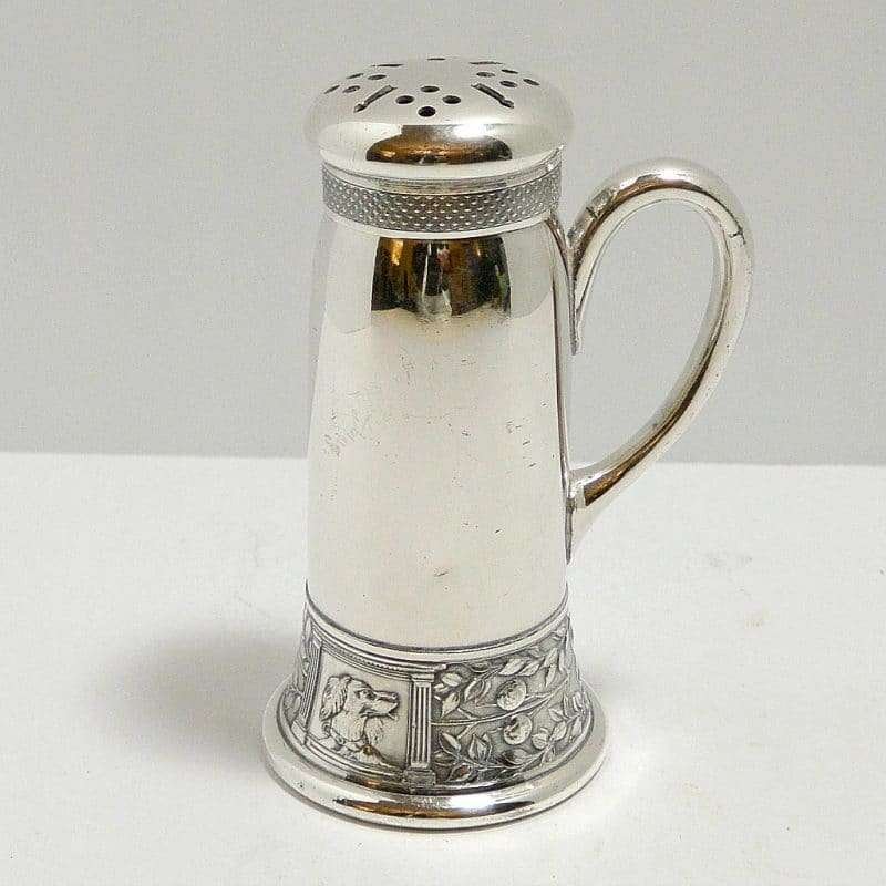 This unique and wonderful sporting dogs sugar shaker was made by Reed & Barton Company of Taunton, Massachusetts c.1860’s. It features a gorgeous floral border along its lower quarter, that also includes two distinctly different portraits of sporting dogs. One dog appears to be either a retriever, or a setter, and the other dog looks to be either a boxer, or a staffordshire terrier. Both portraits are extraordinarily detailed, and show off the dogs to perfection.
