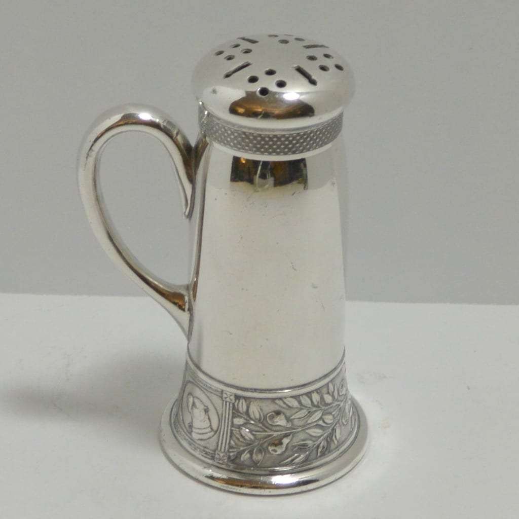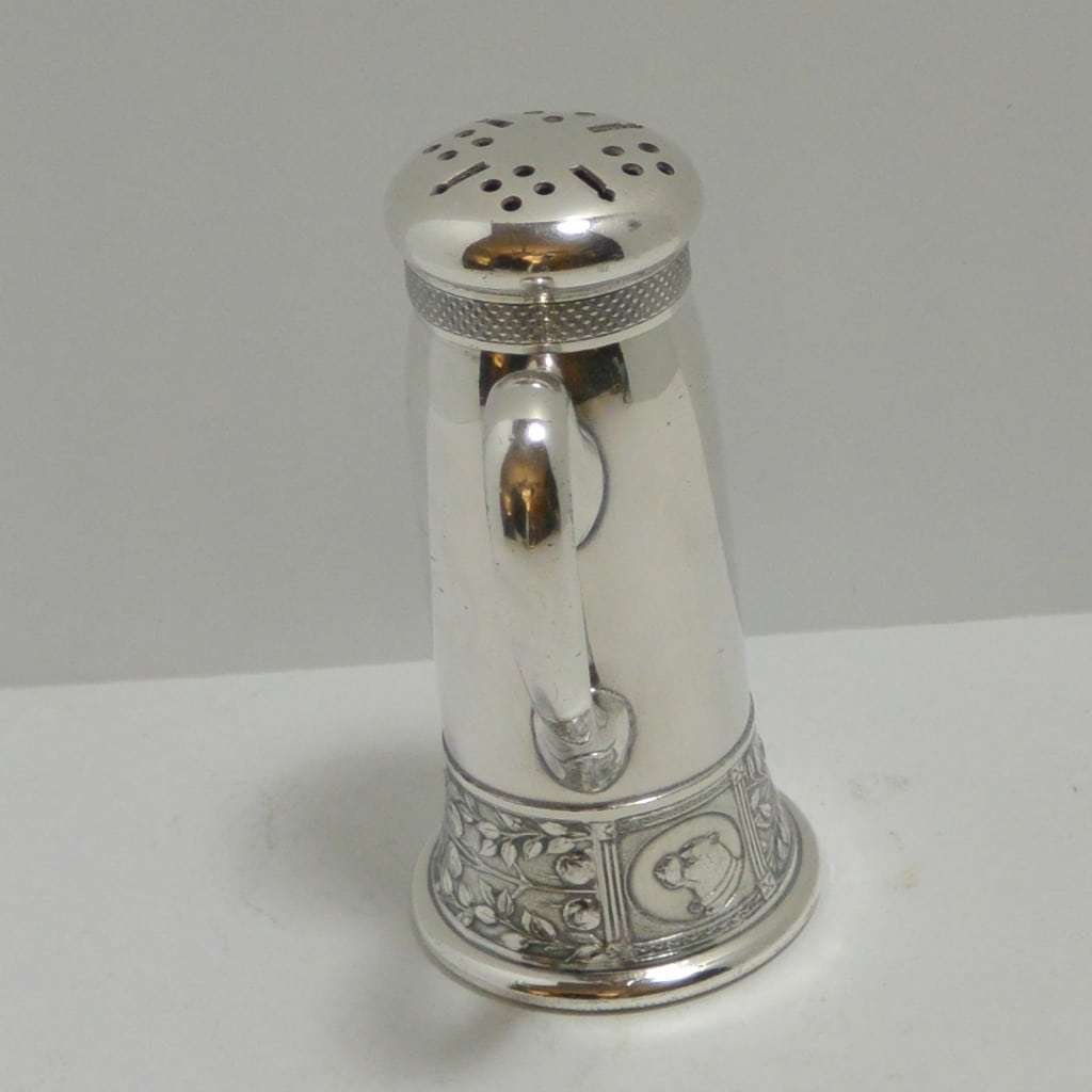 It has a removable lid that has a finely wrought basketweave design along its edge. It also has a graceful handle that distinguishes it from most commonly seen sugar castors.