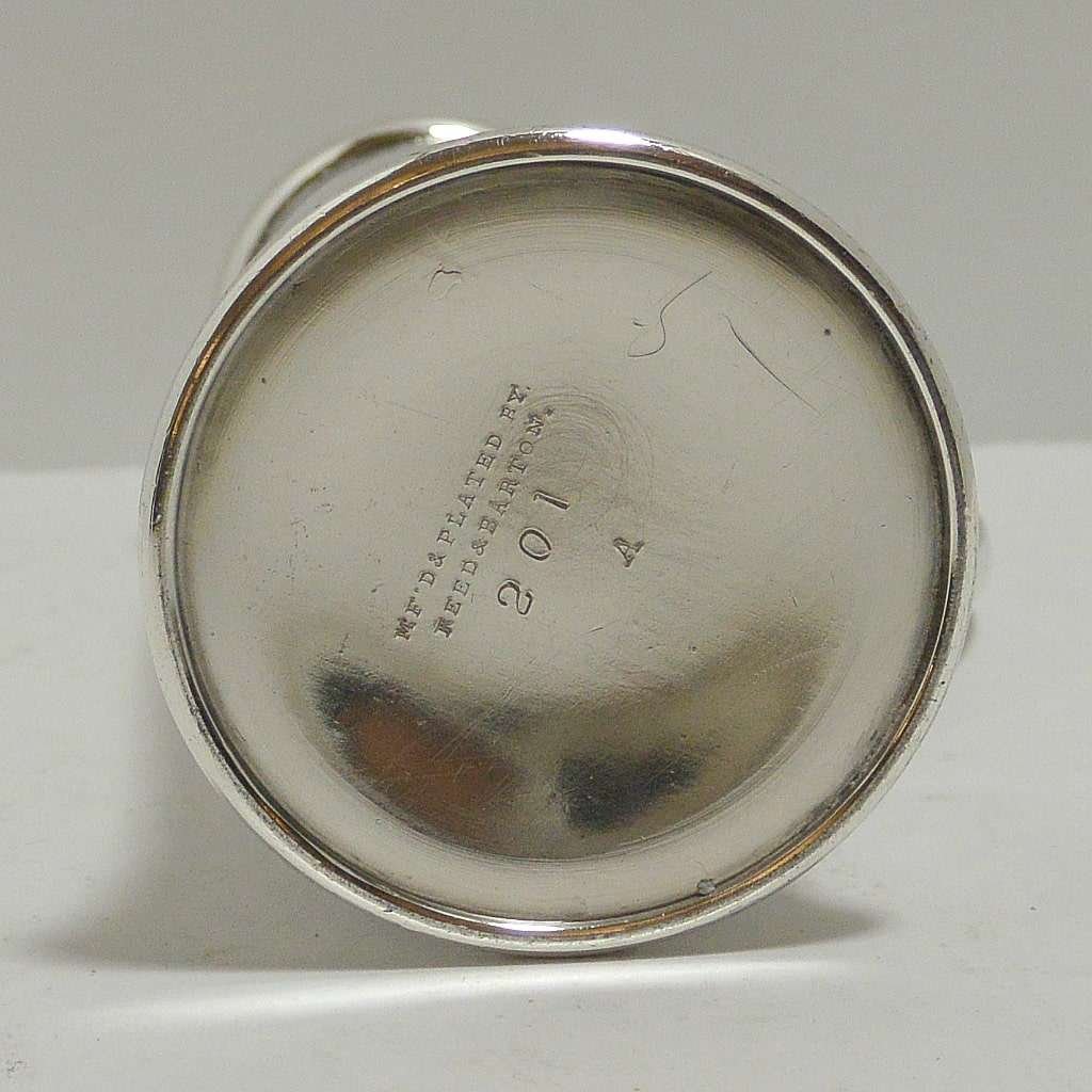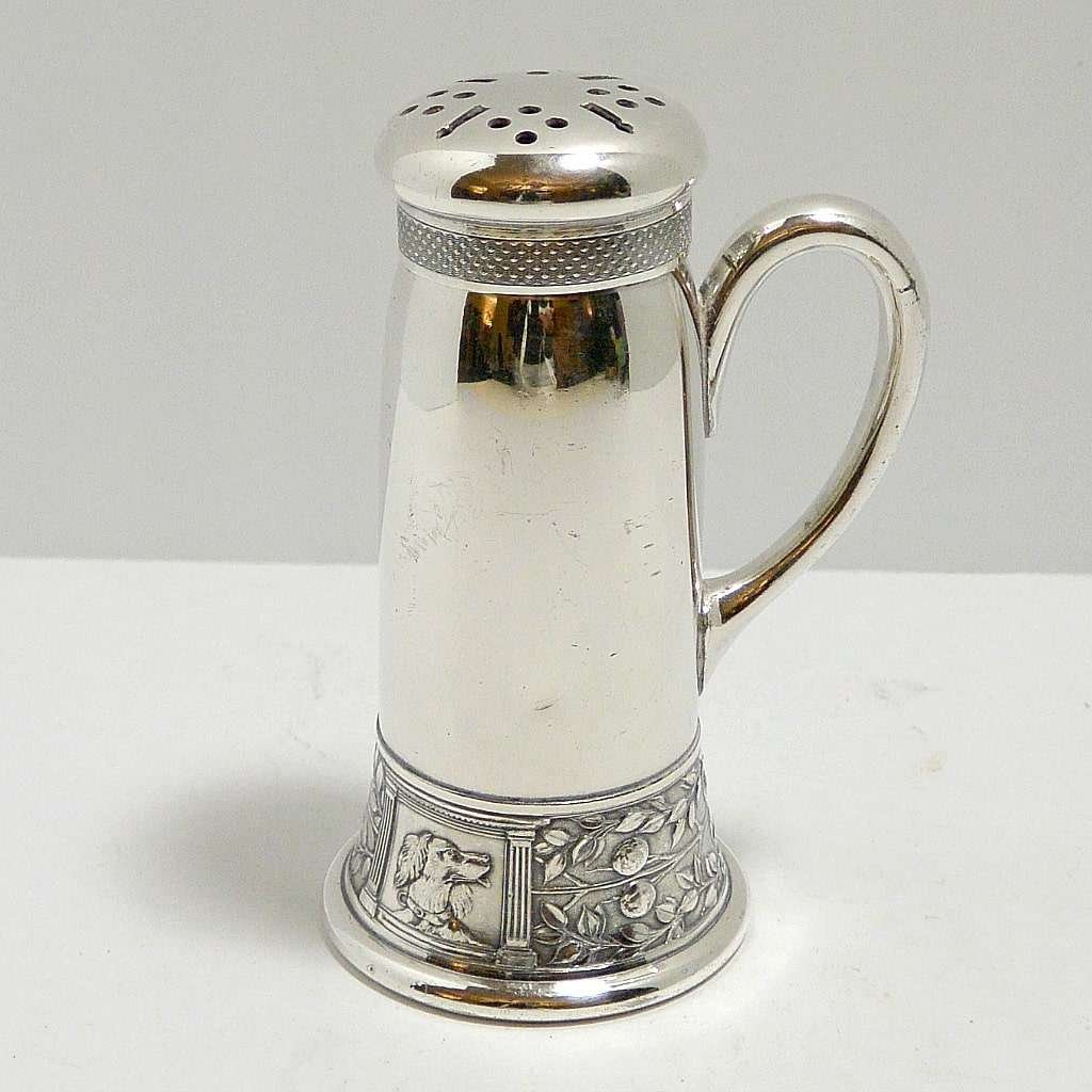 This unique and wonderful sporting dogs sugar shaker was made by Reed & Barton Company of Taunton, Massachusetts c.1860’s. It features a gorgeous floral border along its lower quarter, that also includes two distinctly different portraits of sporting dogs. One dog appears to be either a retriever, or a setter, and the other dog looks to be either a boxer, or a staffordshire terrier. Both portraits are extraordinarily detailed, and show off the dogs to perfection.