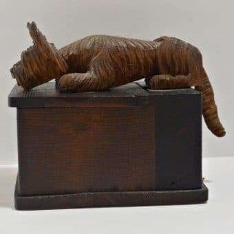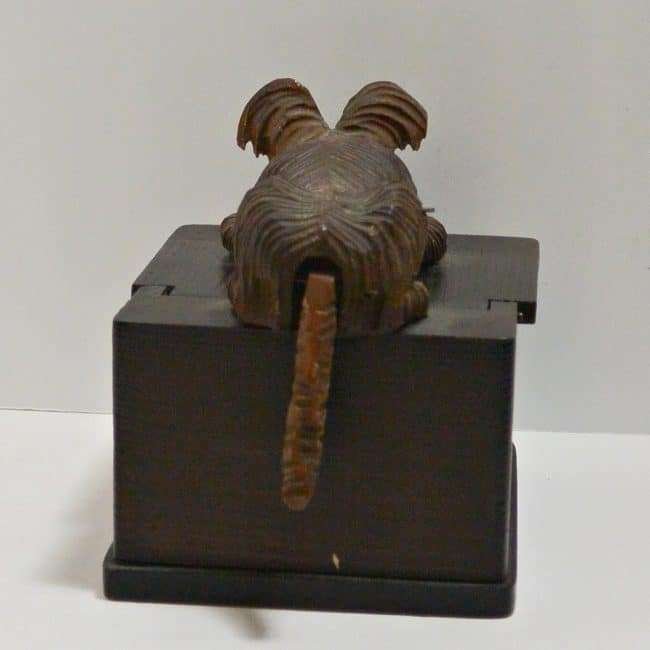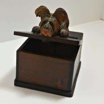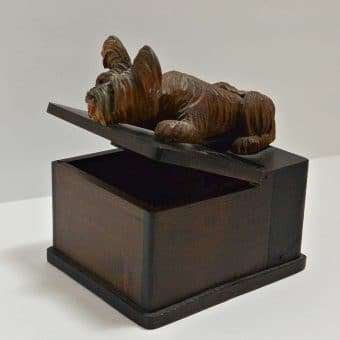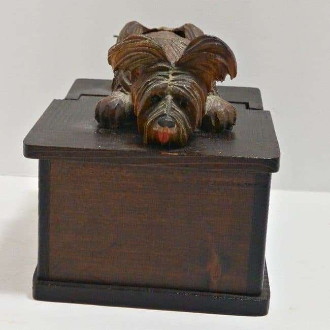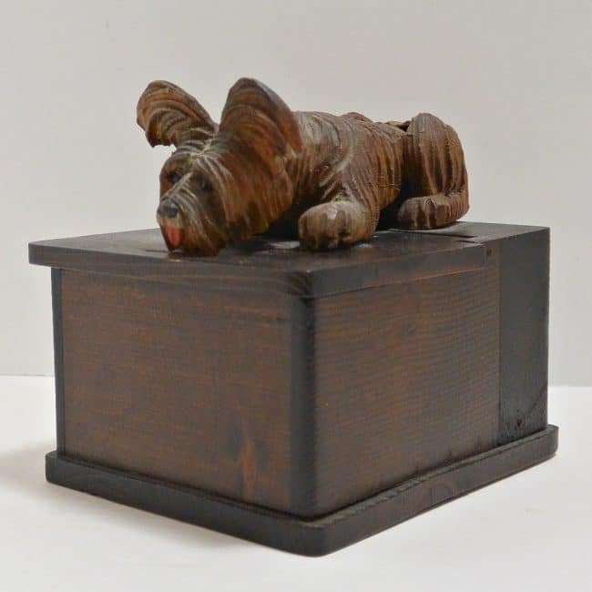 At 4″ tall x 5 3/4″ l x 3 1/2″ wide, this whimsical box, once originally used to hold cigarettes, can easily be re-purposed to hold all sorts of trinkets and treasures. The look of anticipation on this highly-detailed pup’s face, with his bright red tongue hanging out, can’t help but bring out a smile, and perhaps a chuckle from anyone who sees it.