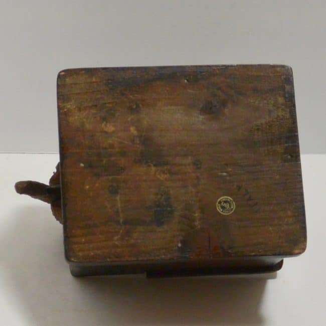 When his tail is pressed, the box opens and he rises to peek over the lid into the opening box. This box is in great condition, the mechanism is fragile, and it works perfectly. The original foil label is still attached to the underside of this box.