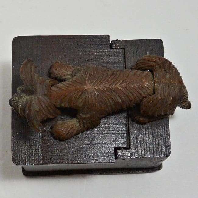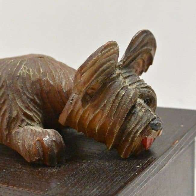 The Skye Terrier dog is one of Anri’s most popular hand carved wood creations. This wonderful pup is lying on top of a wooden box.