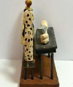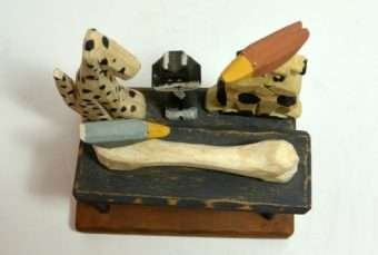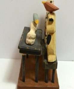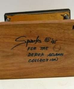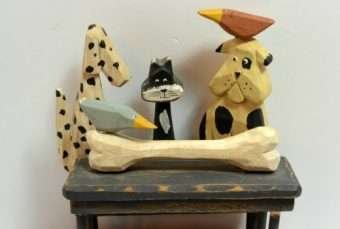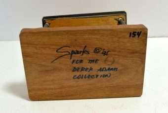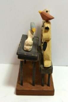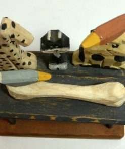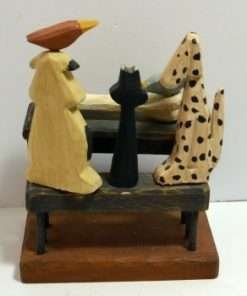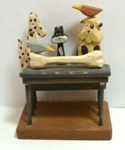 This whimsical, folk art piece is made entirely of wood and hand painted. It is signed “Sparks” for the Derek Adams Collection, 1995. The artist has done a wonderful job of capturing the look of anticipation on each animal’s face as they focus in on how to share a very large bone, set upon the table. If you have multiple pets who share toys and treats, (or you wish they would), this piece is for you! It stands 7 1/2″ tall x 6″ long x 4″ wide and it is in excellent condition.