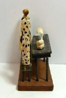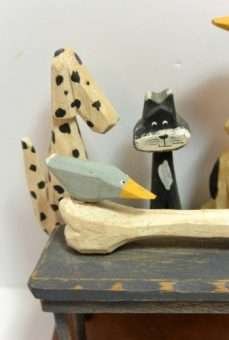 This whimsical, folk art piece is made entirely of wood and hand painted. It is signed “Sparks” for the Derek Adams Collection, 1995. The artist has done a wonderful job of capturing the look of anticipation on each animal’s face as they focus in on how to share a very large bone, set upon the table.