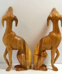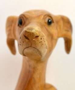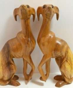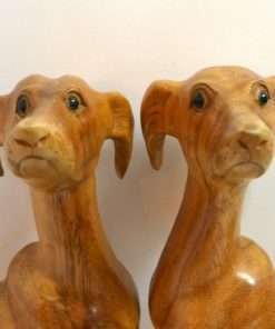 This matched pair of hand-carved wood Whippet dogs are just extraordinary! Made in the UK, where this fabulous breed originated, they stand a full 12″ tall x 5″ long x 2 1/4″ wide. They are carved from a heavy hardwood, and they have a gorgeous, natural color gradient that resembles the variations you would see in a dog’s coat. Sitting with one paw raised and noses pointed slightly upwards, they capture both the gentle temperament, and the racy, athletic build of these elegant dogs. They are in excellent condition. They have been together for many years, and they look so beautiful as a pair, we are selling them together.