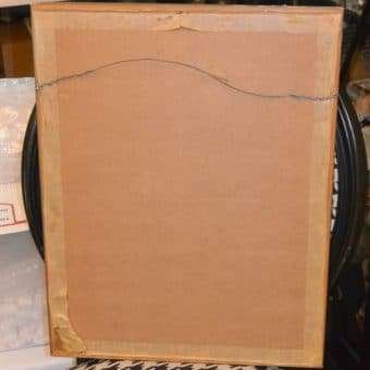It is matted and framed under glass in a combination silver/gold painted wooden frame. There are two small chips along the top of the frame that do not show from the front.