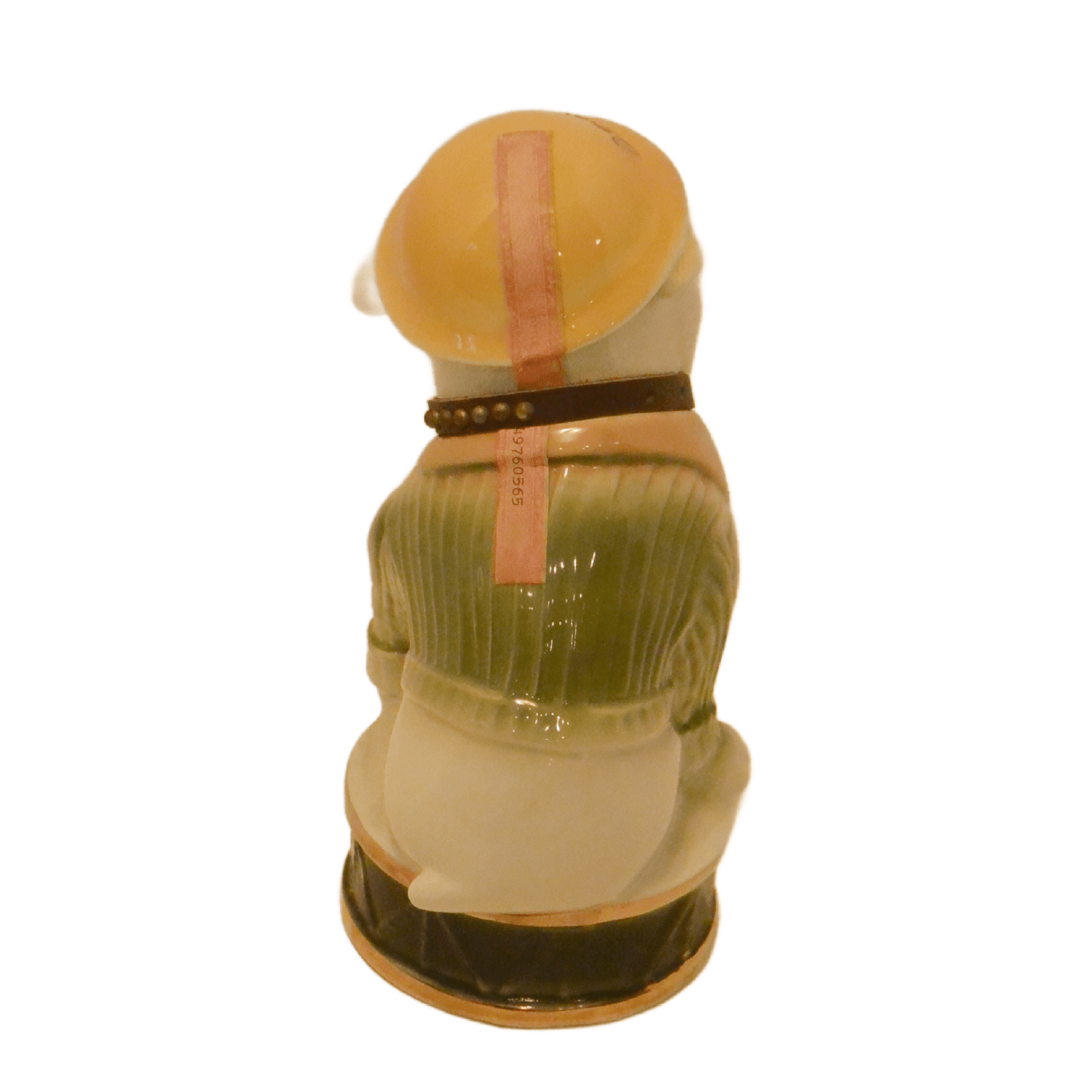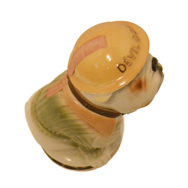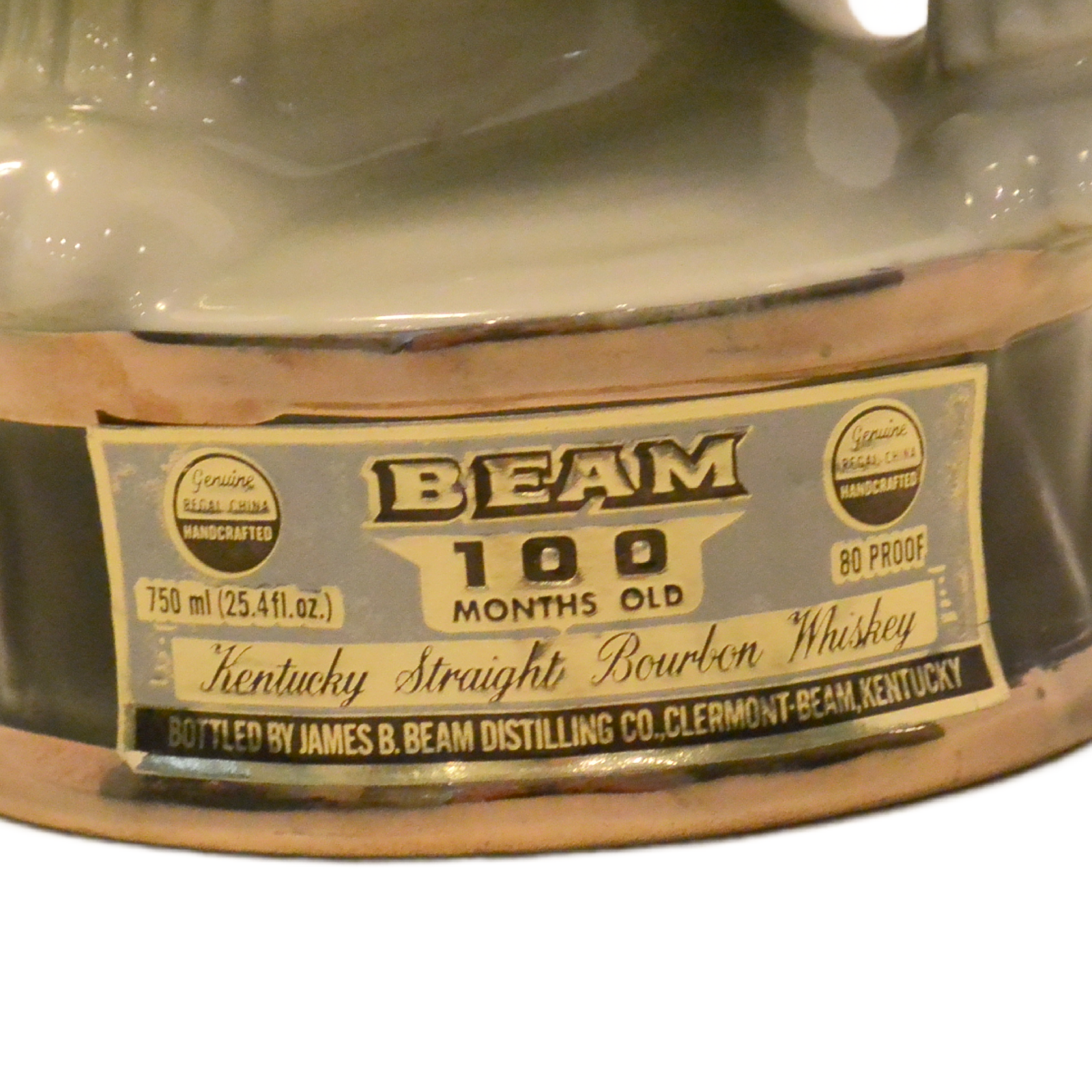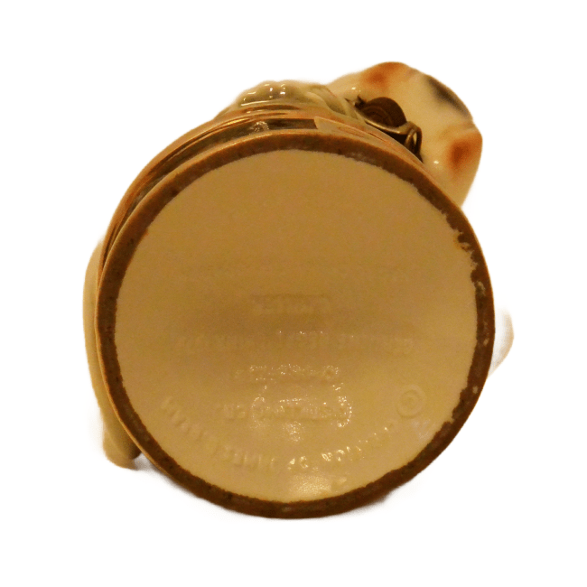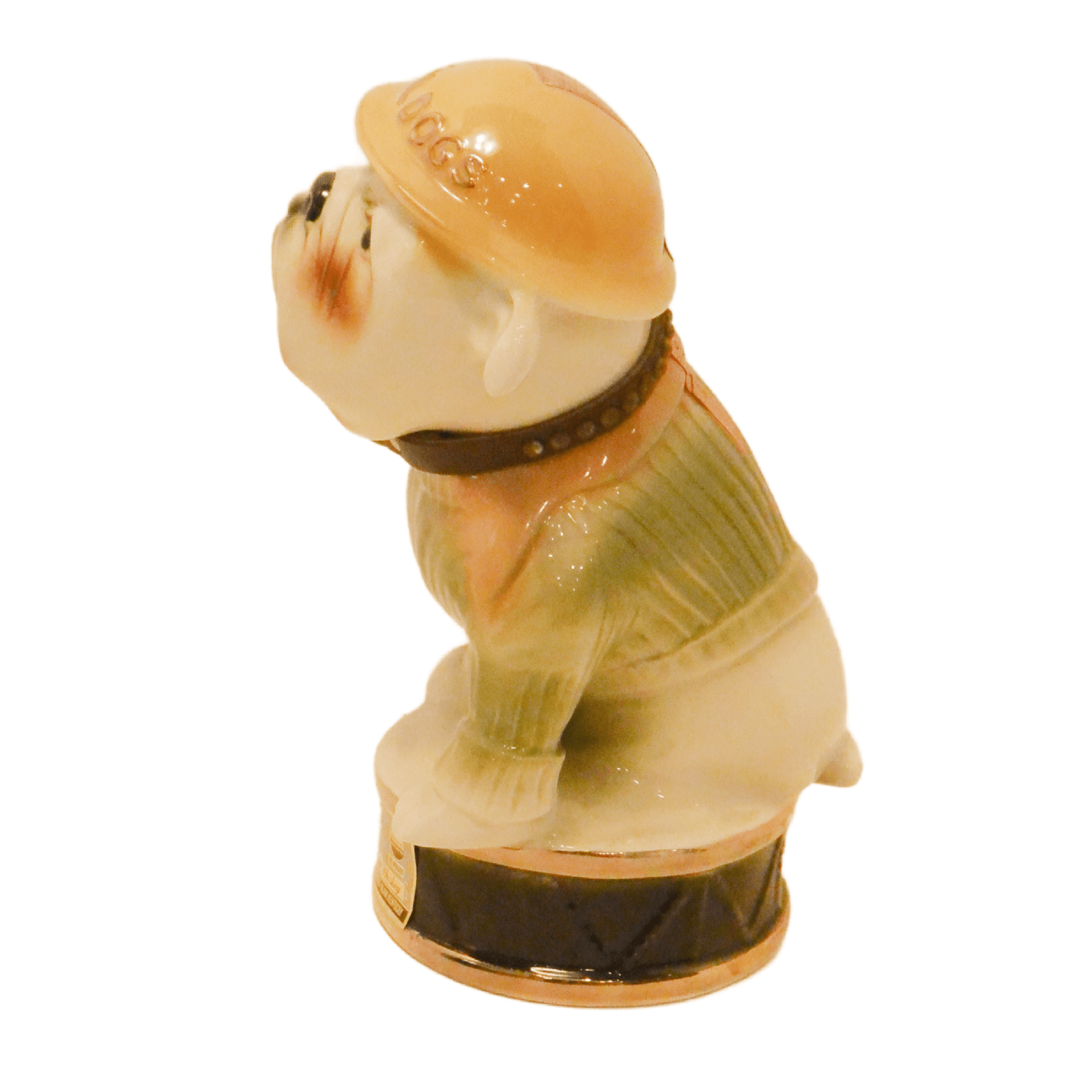 This wonderful decanter is in excellent condition with its original label on the front of the base, and the label , broken, but still in great shape, on the back of the dog’s helmet. The decanter is empty, and clean.