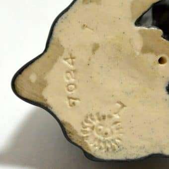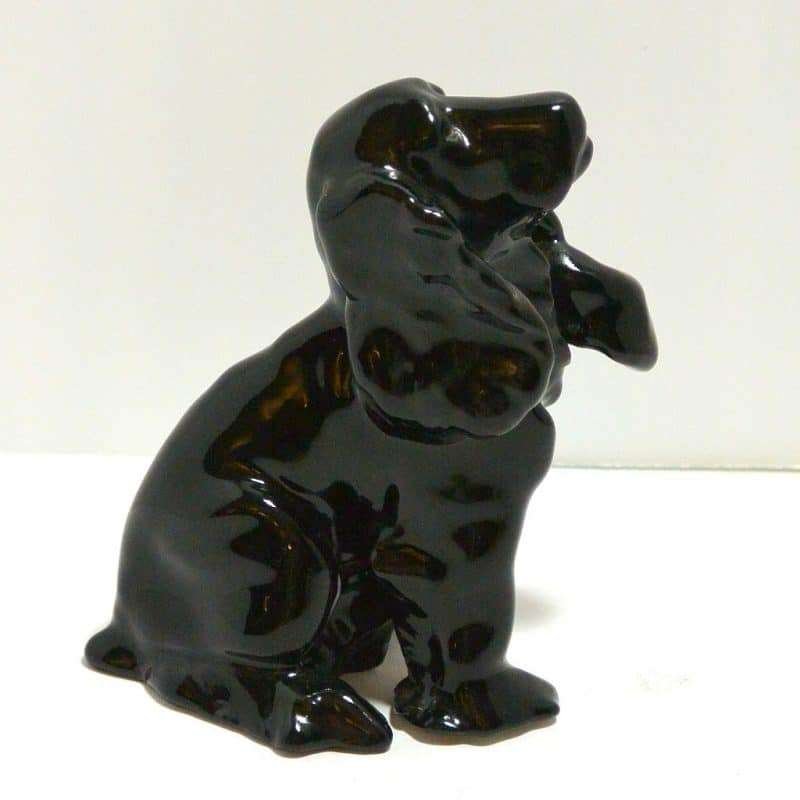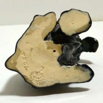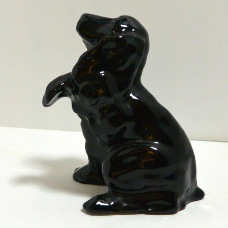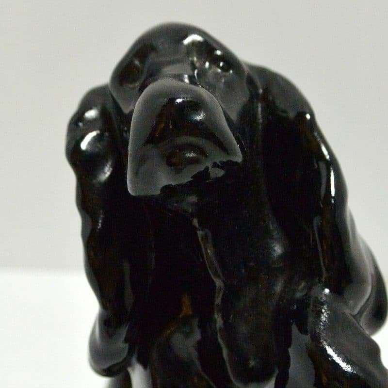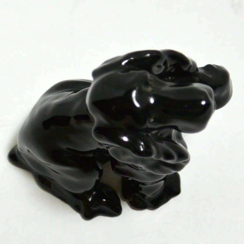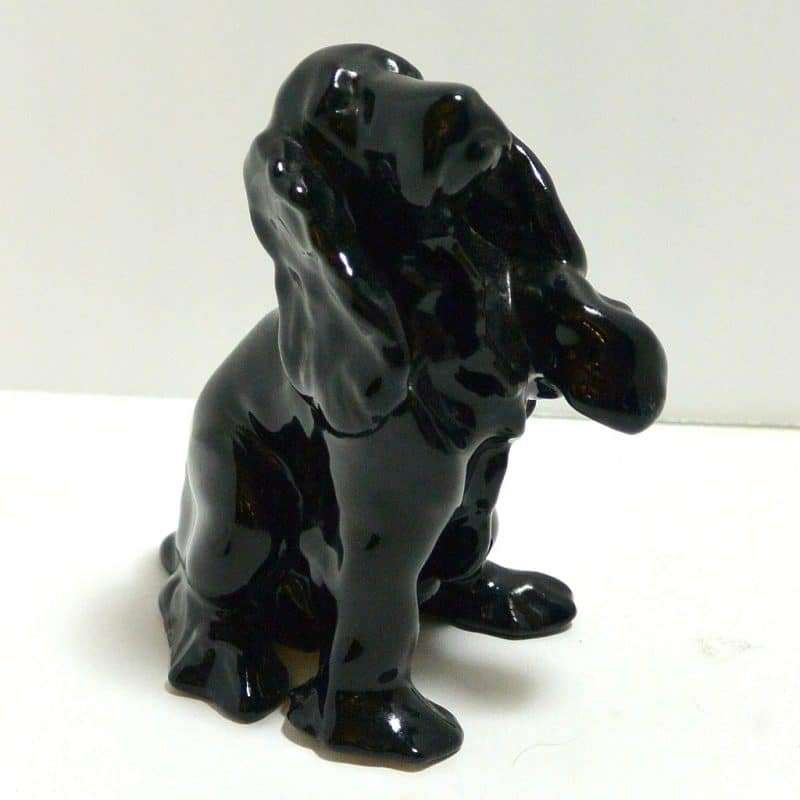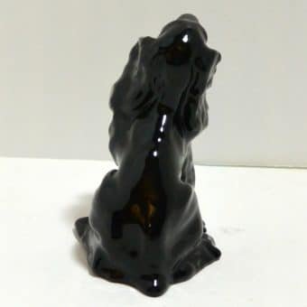 This Rookwood dog figurine is a beautiful, black Cocker Spaniel. It was done in a deep, dark, glossy black glaze that is just stunning. Measuring 4 1/4″ tall x 3″ long x 2 1/2″ wide, it is in mint condition.