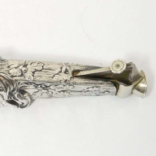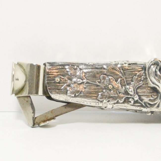 Measuring 1″ tall x 6″ long x 1 1/4″ wide, this antique cigar cutter is in extraordinary condition, with only very mild wear of the silverplate.