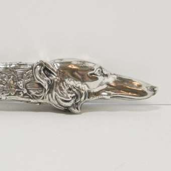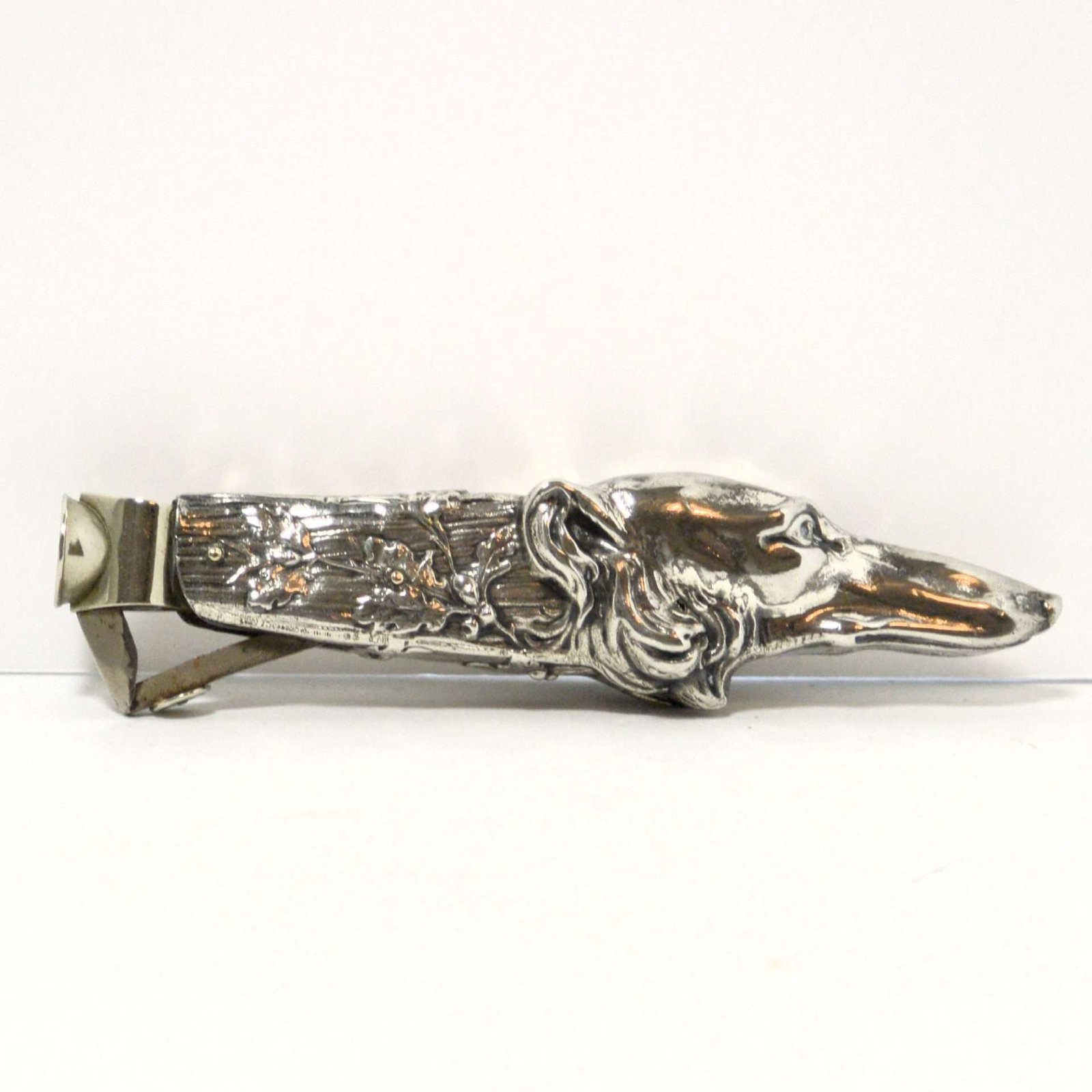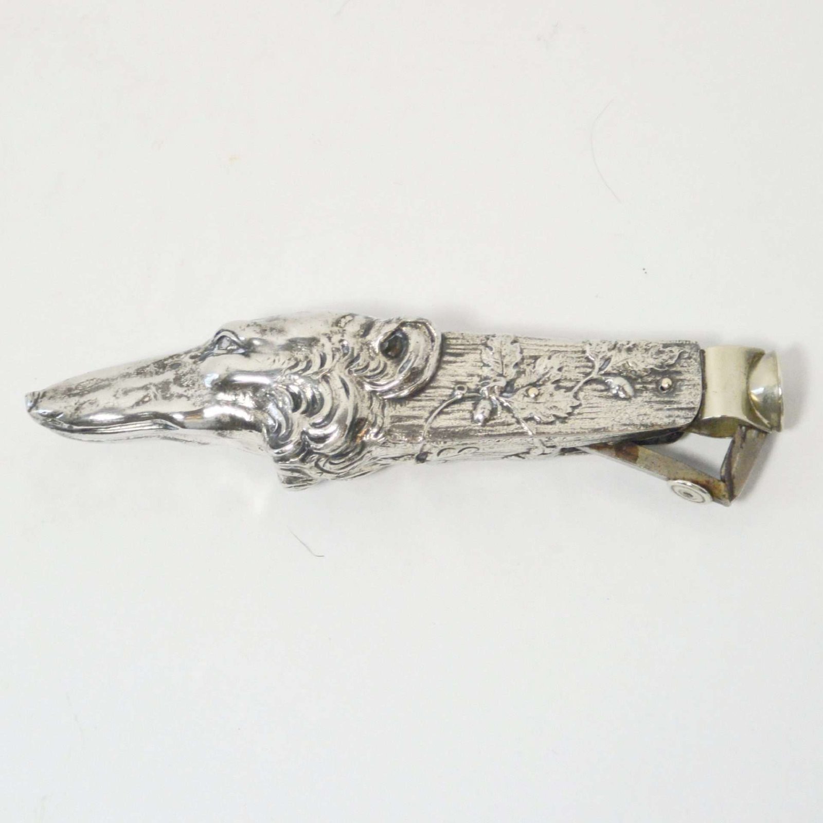 This exquisite, silverplate cigar cutter is the perfect example of Art Nouveau design, with its intricate pattern of vines and leaves, combined with the flowing fur lines of the Borzoi.