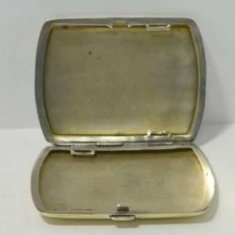 This beautiful, silverplate, cigarette case is gorgeously illustrated with an image of a Pointer dog done in porcelain enamel. Measuring 3 3/4″ long x 2 3/4 tall, it is gilded on the inside and on the back. It has a tightly working button closure. There is some mild scratching due to its age, but it is otherwise in excellent condition.