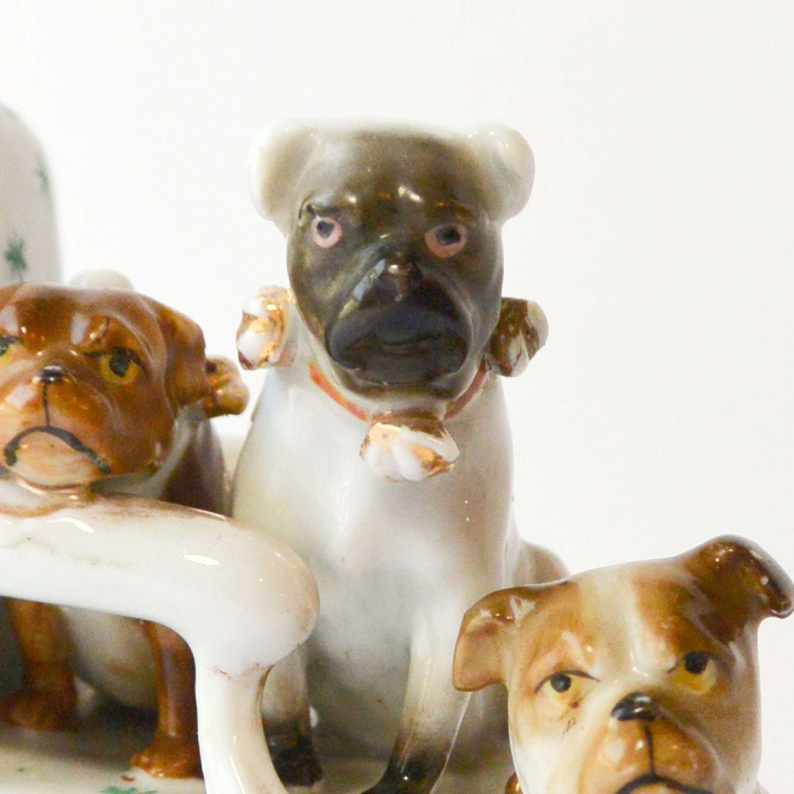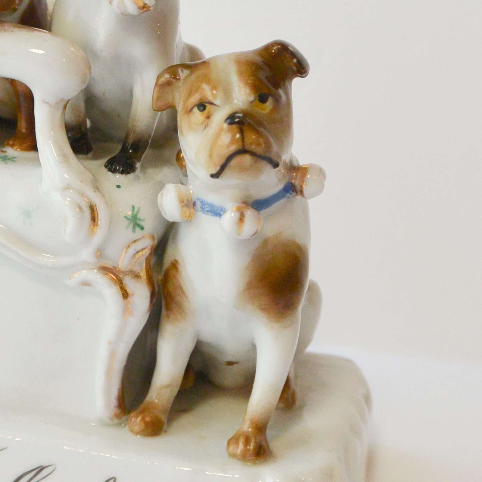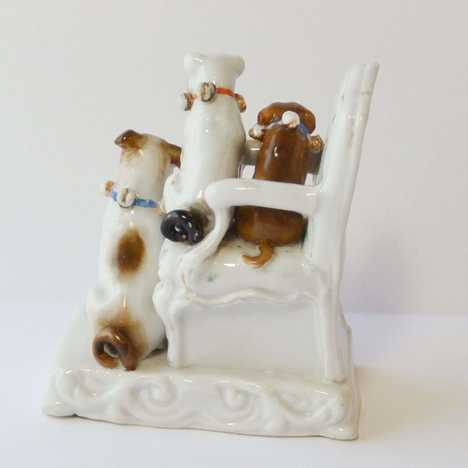 This whimsical porcelain Pug dog fairing, captures the mischievous spirit of three dogs, two of whom seem to have found their way onto the parlor furniture.