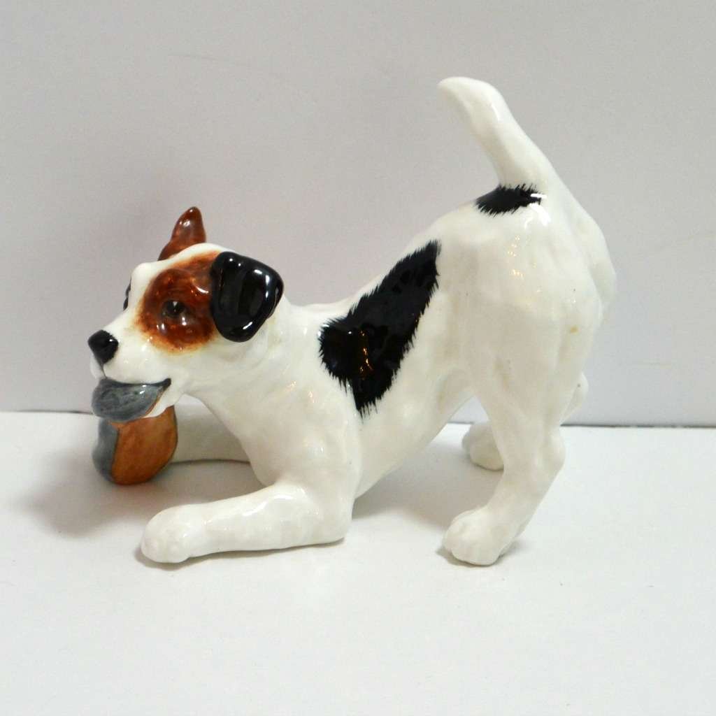 This whimsical Jack Russell dog has pounced on a slipper and is having a grand time with it! He was issued by Royal Doulton in 1937 as part of the “Dogs of Character” series, which was a series of 12 dogs, modeled in various poses, and believed to be inspired by the works of Cecil Aldin, a popular British artist and illustrator. This wonderful pup has a perfect high gloss finish, and bears the green Royal Doulton backstamp and the mold # H.N. 2654. He is in excellent condition and stands 3 1/2″ tall x 4″ long x 2″ wide. If you collect this series or are tempted to, now’s the time to snatch this pup up! Take a look at our last picture to see the 4 “Dogs of Character” that we currently have in our shop. He also works well in a mix with other Jack Russell Terrier figurines by different artists, and makes a perfect gift to any lover of this high-energy and brilliant breed!