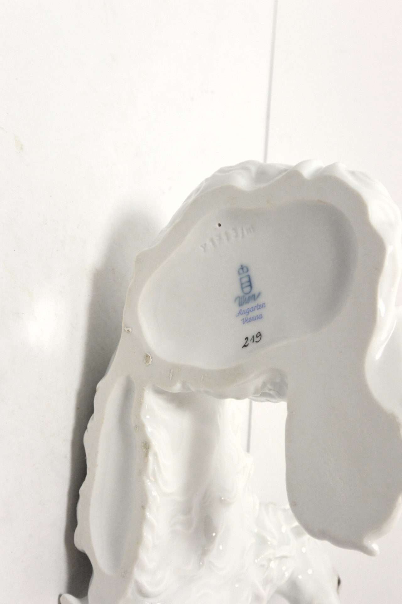 It is marked on the underside with the Augarten blue shield and crown, with the word “Wien” below as well as the impressed number 1713/lll and the artist’s. It also has the painter’s number 219 painted in black.