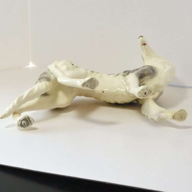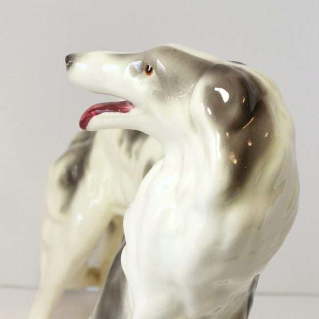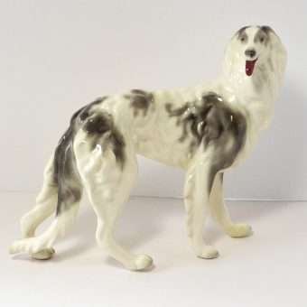 She is one of the “harder-to-find” vintage porcelain Borzoi figurines, which measures a full 9 1/2″ tall x 11″ long x 2 1/2″ wide.