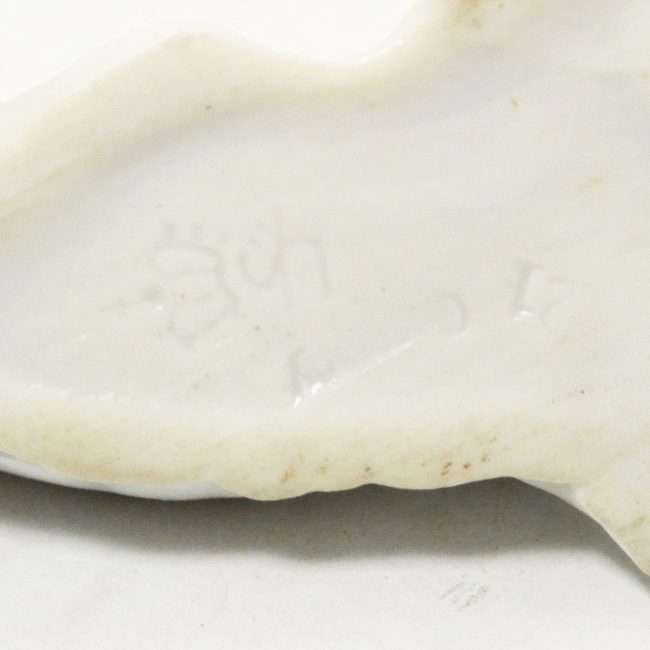 Made by the Sitzendorf Porcelain Factory in the Dresden area of, Germany, in the early 1900’s, she measures 2 1/2″ tall x 5″ long x 1 3/4″ wide and is in excellent condition.