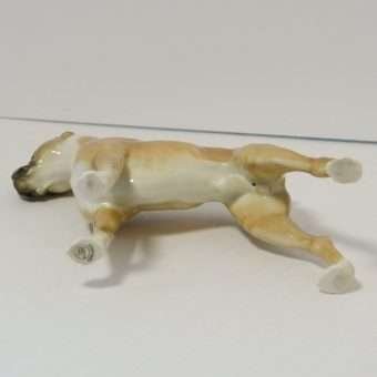 He stands a full 6 1/2″ tall x 7 3/4″ long x 2 3/4″ wide. He has a Hutschenreuther stamp on the underside of his right, front paw. He is in mint condition, with the exception of a very tiny chip at the top of his ear. His glaze is so bright that the marks you might see in the pictures, are only the result of the flash of the camera.