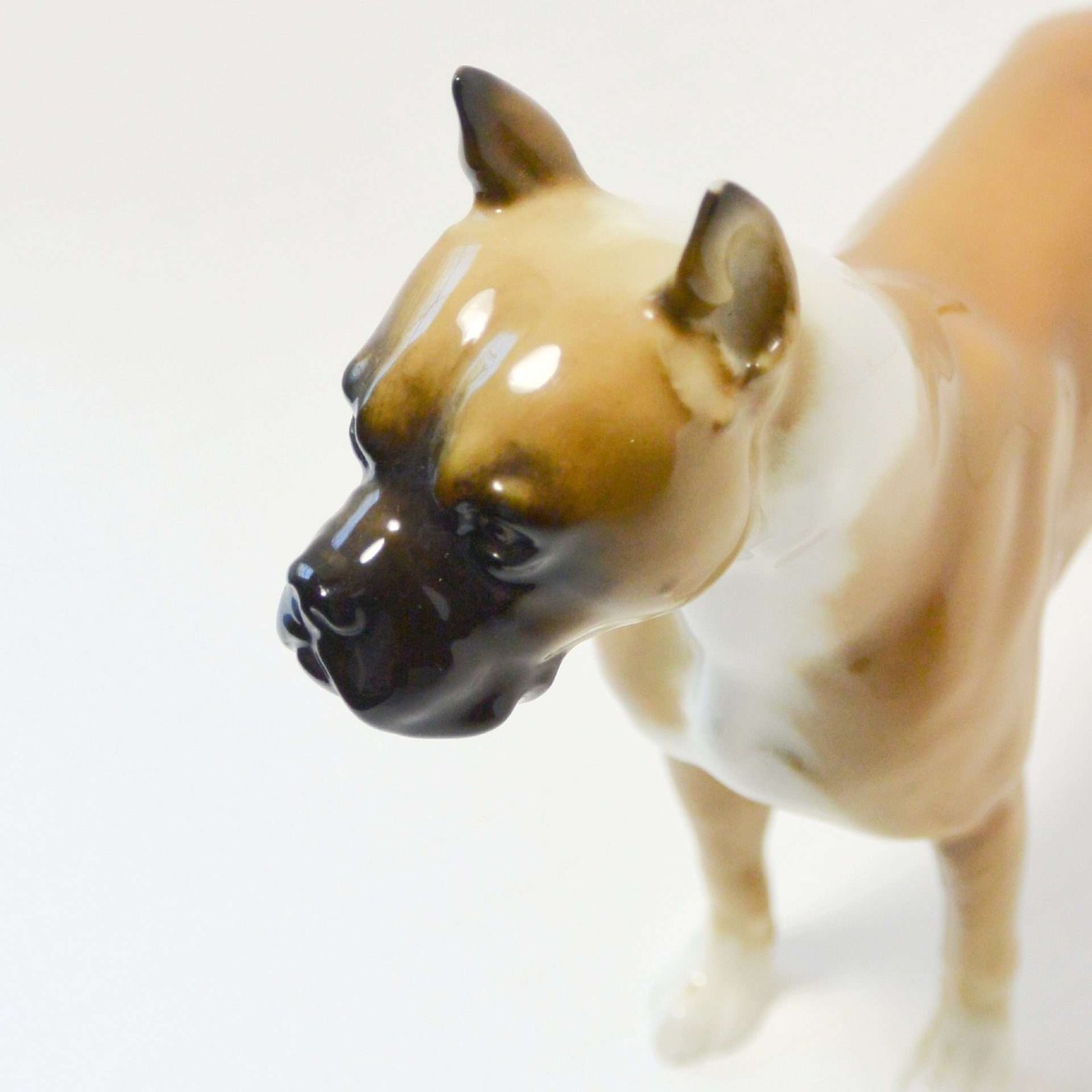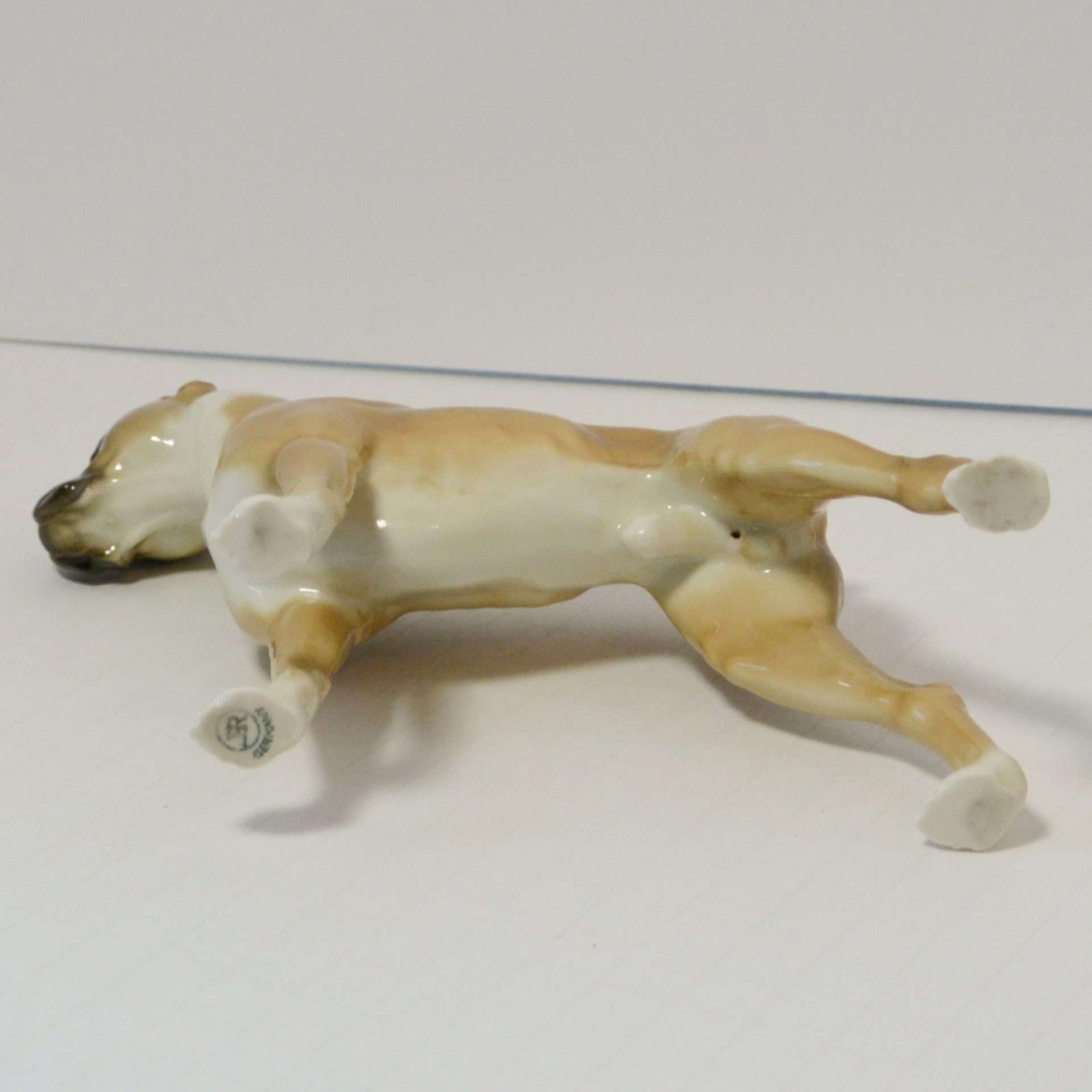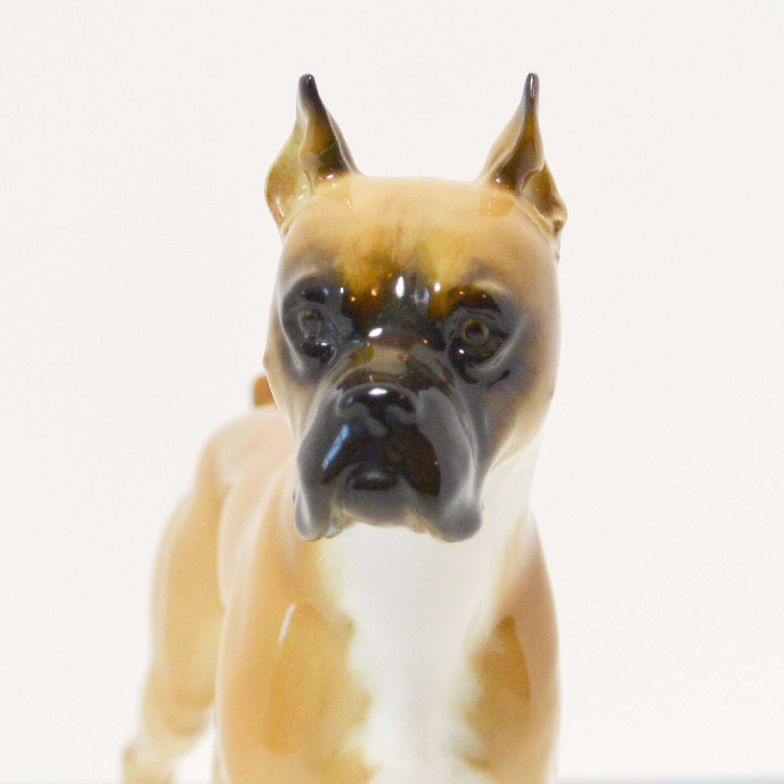 This elegant Boxer dog figurine carries all the characteristics of this wonderful breed. This dog figurine has the the distinctive, and highly detailed look of all canine porcelain figurines designed by the artists of Hutschenreuther of Germany. Looking at this porcelain figurine, you can’t help but feel like you are meeting his real “flesh & fur” counterpart. Known most often as an upbeat and clownishly playful breed, this wonderful Boxer portrays, instead, his patient and protective nature.