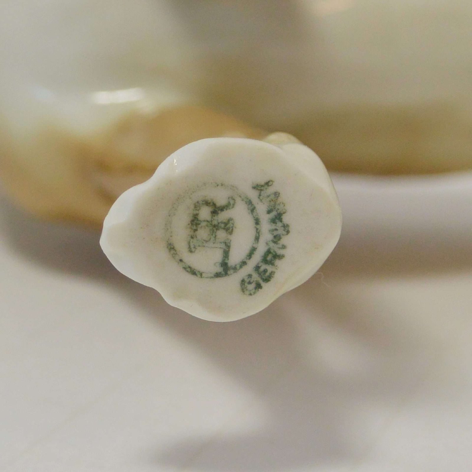 He stands a full 6 1/2″ tall x 7 3/4″ long x 2 3/4″ wide. He has a Hutschenreuther stamp on the underside of his right, front paw. He is in mint condition, with the exception of a very tiny chip at the top of his ear. His glaze is so bright that the marks you might see in the pictures, are only the result of the flash of the camera.