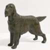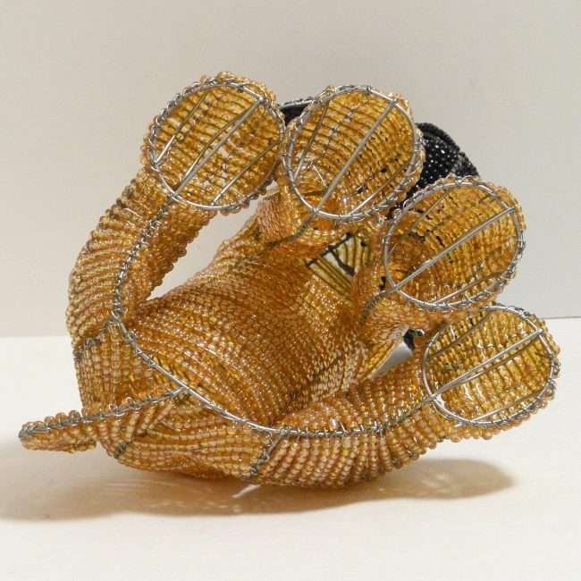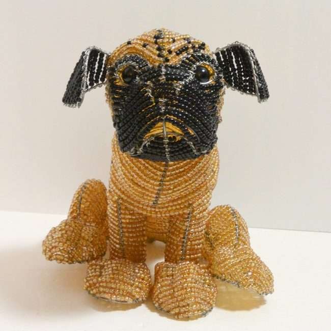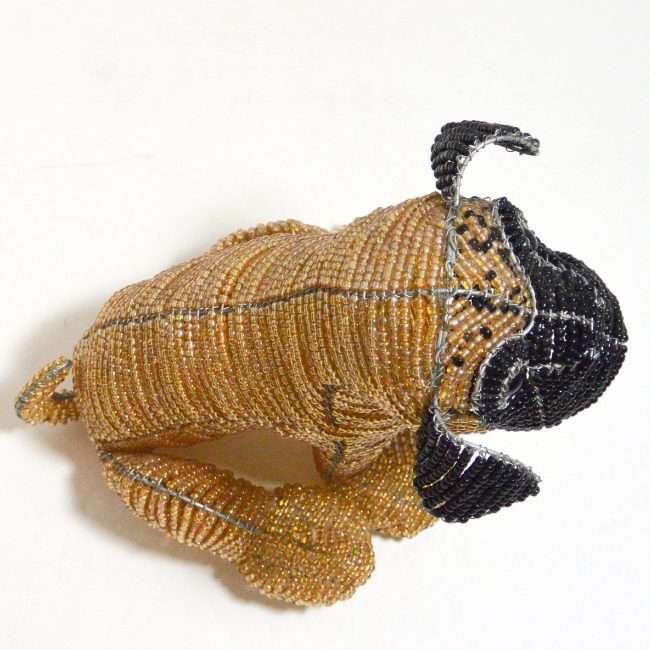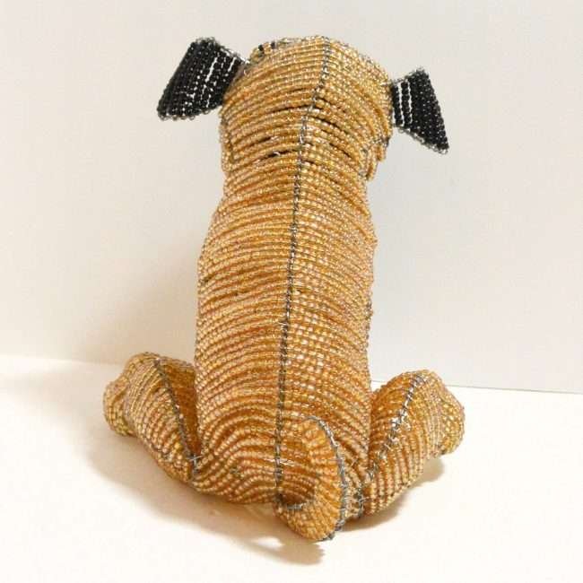 Measuring a full 8″ tall x 8″ long x 7 1/2″ wide, he is a handmade dog figurine, made of galvanized steel wire, and covered in metallic gold and black glass beads.