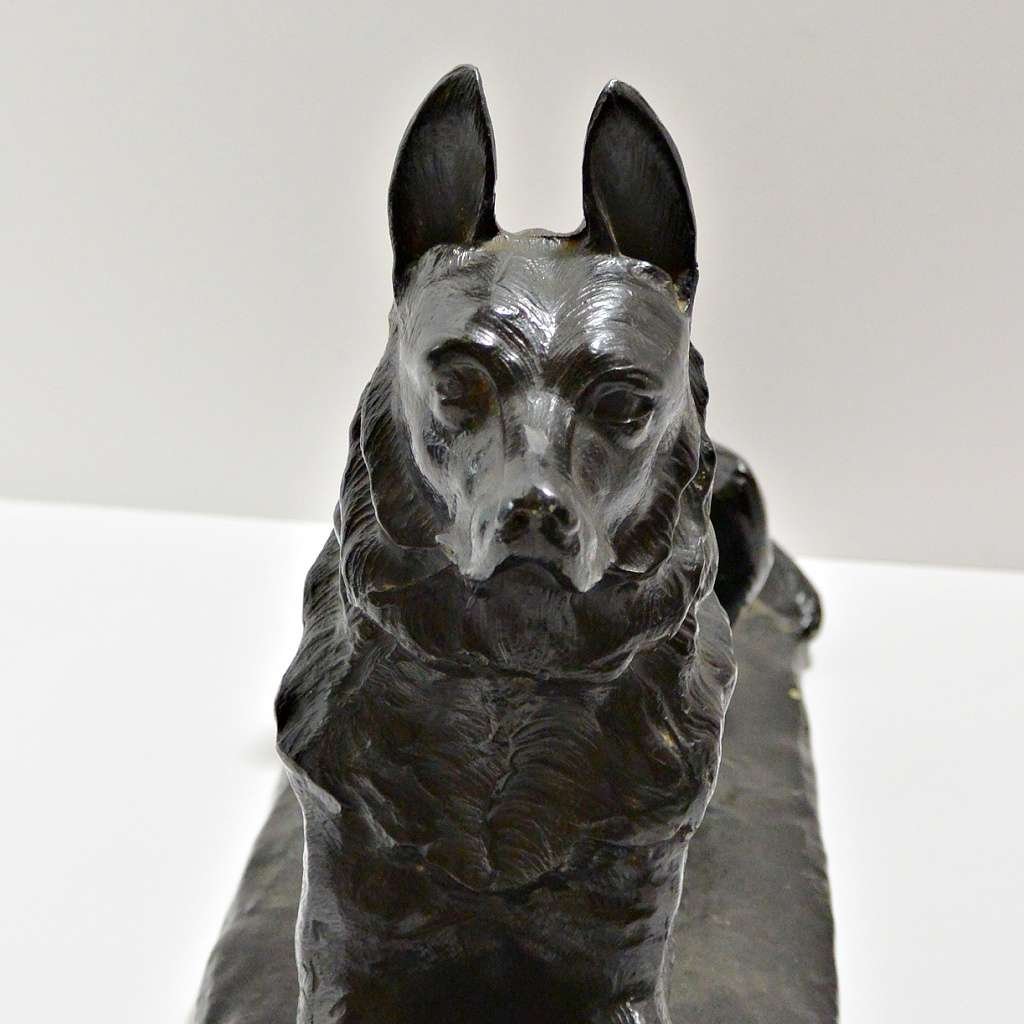This unique, cast iron, reclining dog is a gorgeous German Shepherd.