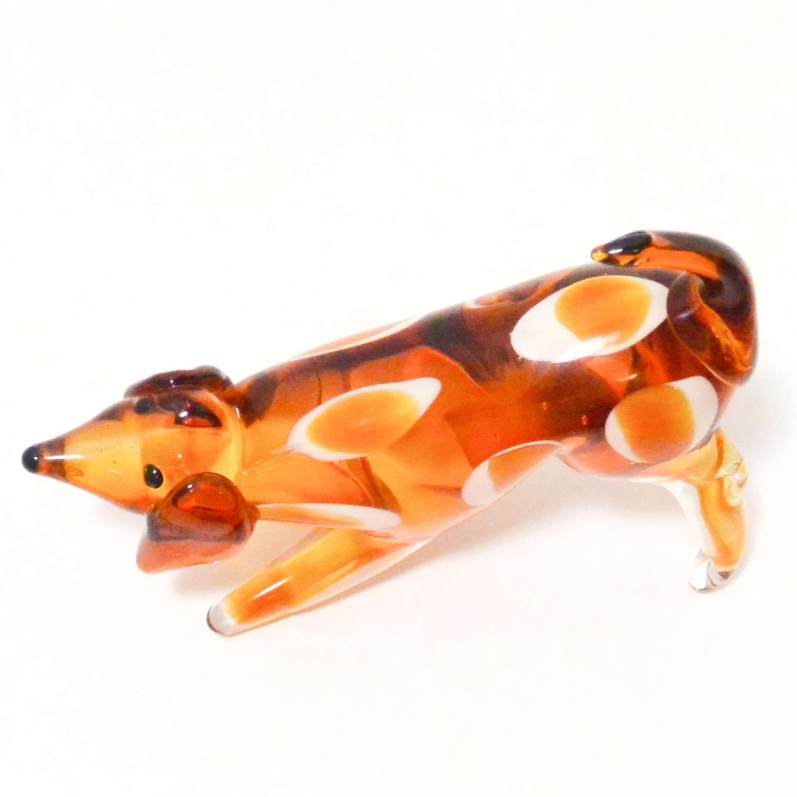 Done in a rich amber glass against a clear glass skeleton, this charming dog is accented with combination white/yellow-gold spots. He also has black glass eyes and a small black glass nose.