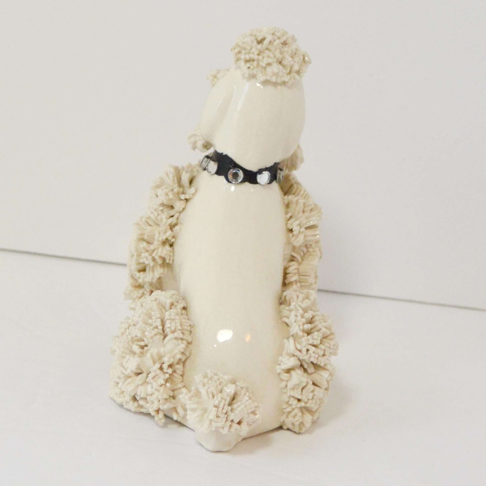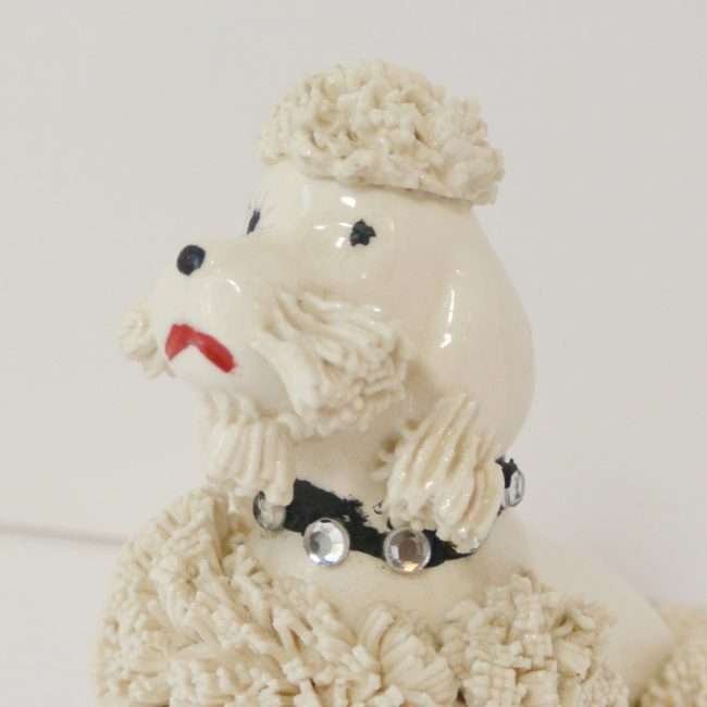 Ooo la la! This pretty vintage, spaghetti poodle is wearing a lovely, shiny black collar studded with eight beautiful rhinestones.
