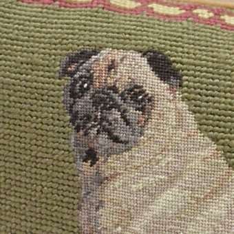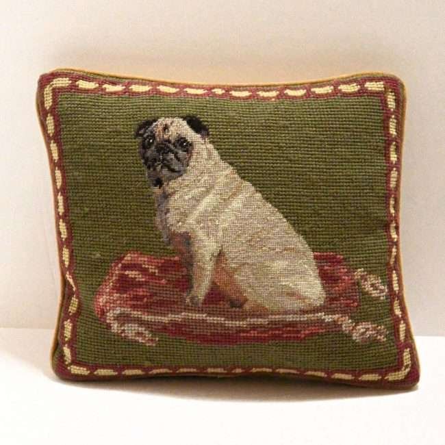 It is flawlessly done in a combination of petit point needlework for the Pug and needlepoint for the background, the pillow’s border, and the tasseled pillow that the pug is sitting on.