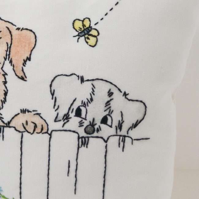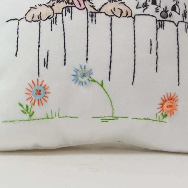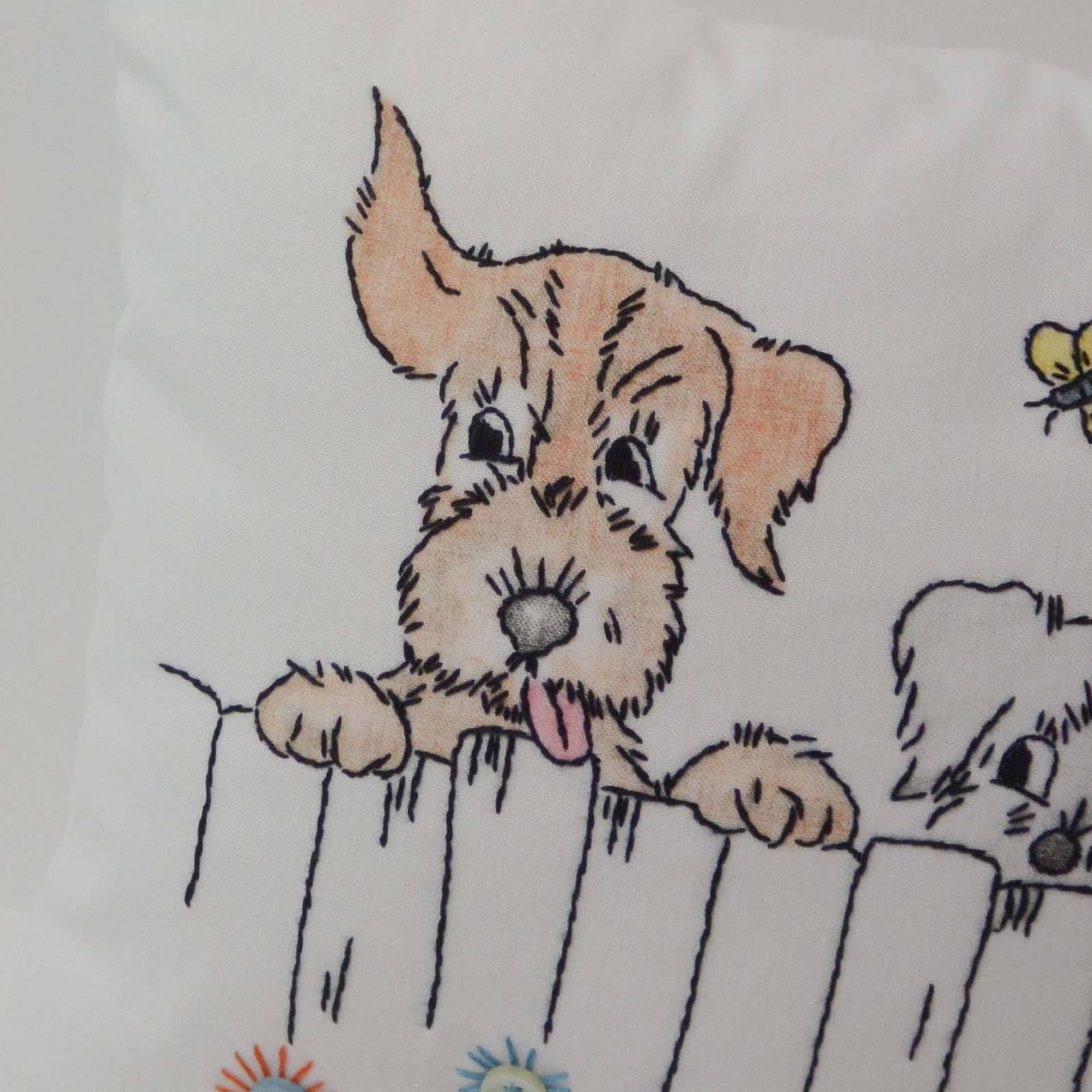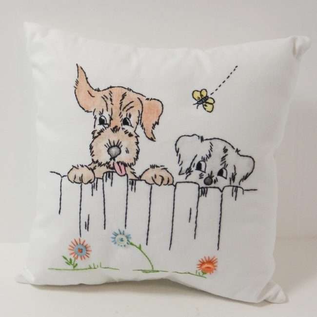 This wonderful pillow features two adorable puppies peering over the top of a picket fence.