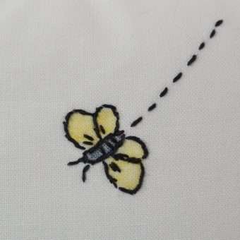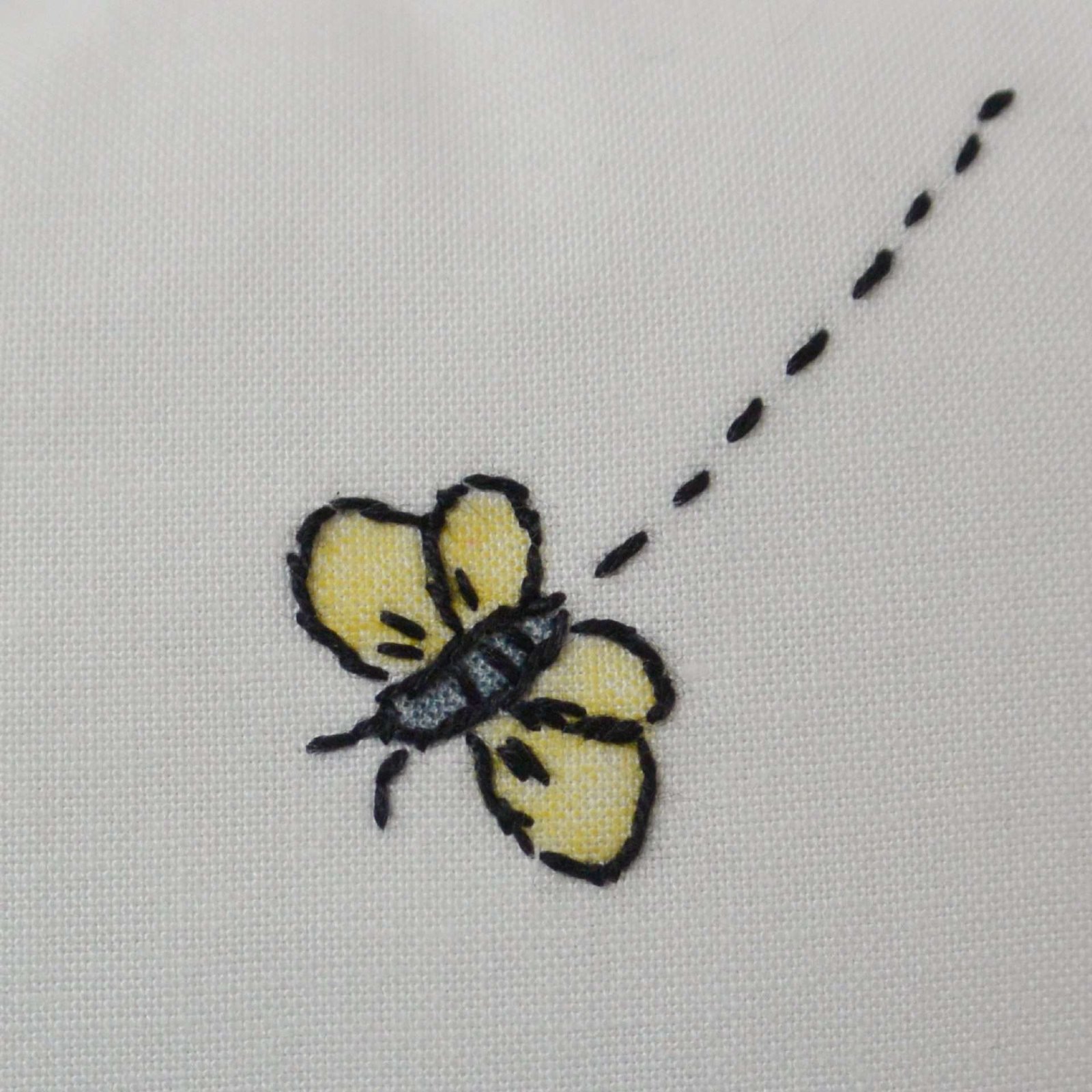 The pillow is also embellished with a Friendly” bubmble bee and a few posies with white, baby pink, and baby blue button centers.