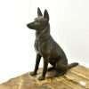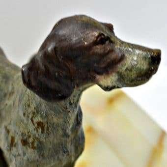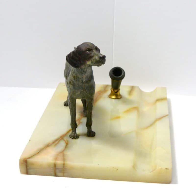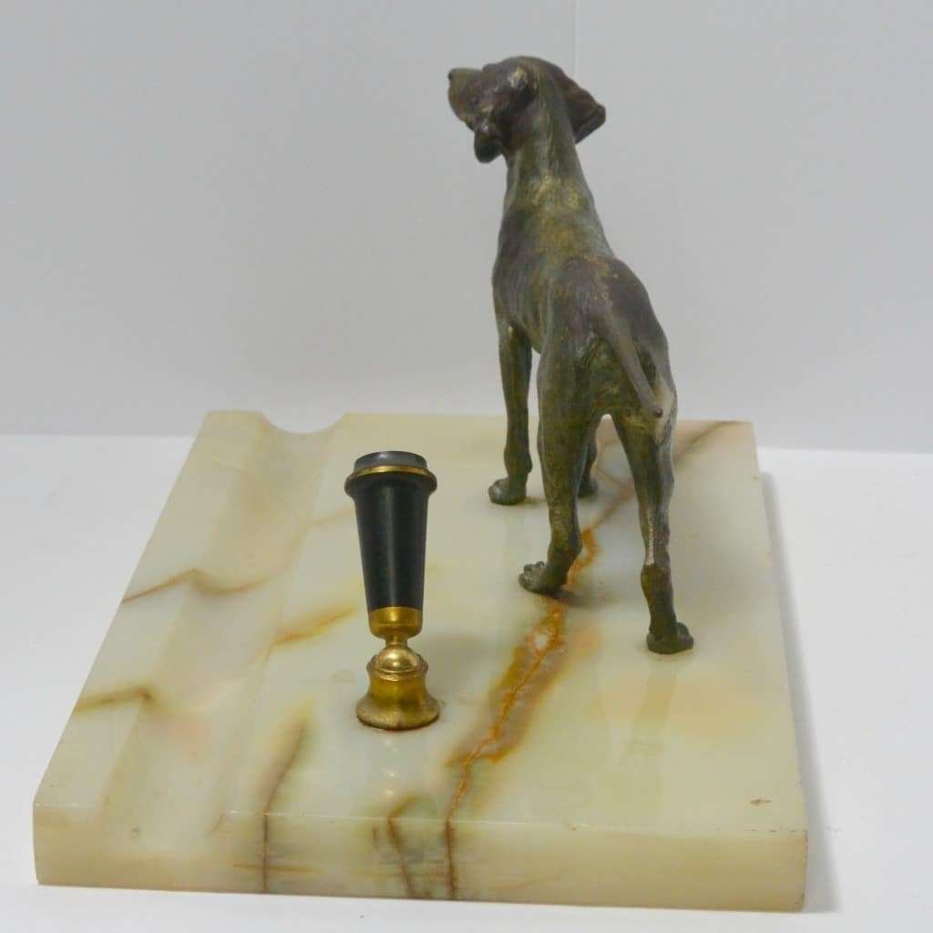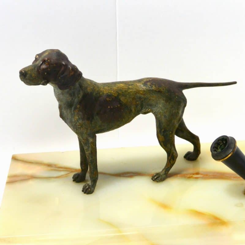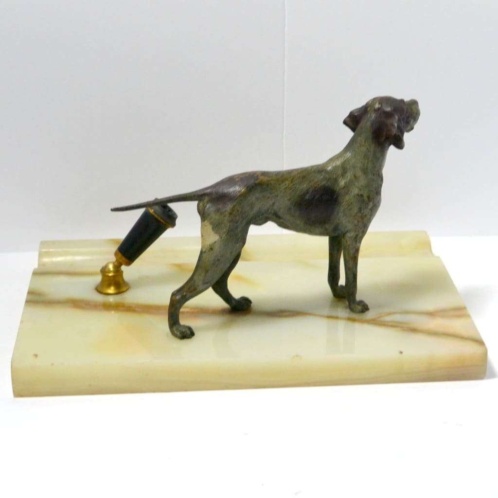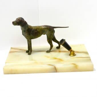 This large, vintage, desk set consists of a cold-painted bronze Pointer dog which is 5 1/2″ tall x 8 1/4″ long x 2″ wide, a marble base that measures 11 1/2″ long x 7 1/2″ wide, and its original swivel Bakelite pen holder.