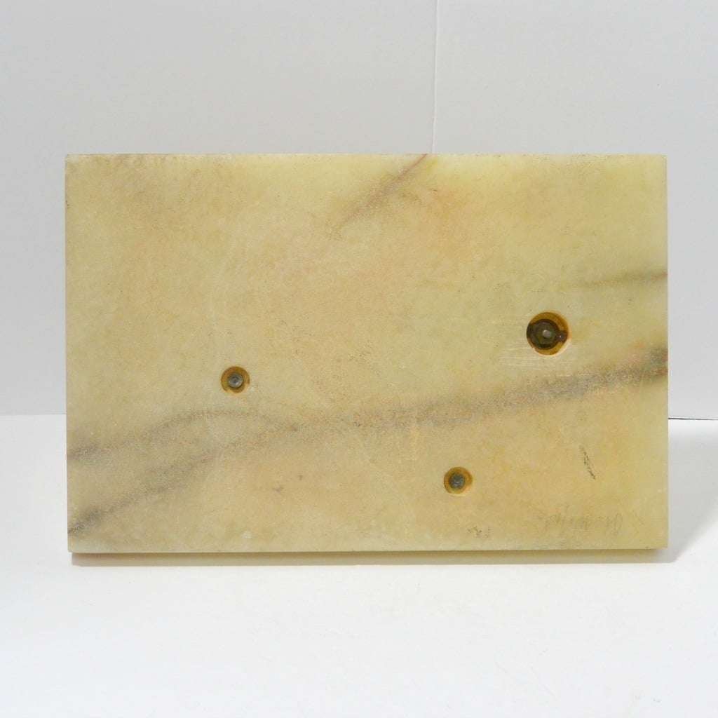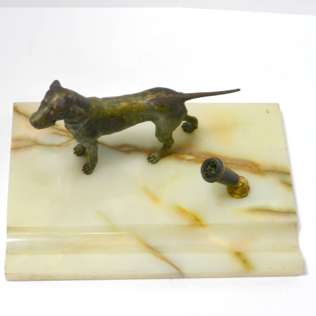 The marble base is quite heavy, and it has a 1 1/2″ groove along the full length of the base to hold additional writing instruments. It is in great condition, with some paint worn off of the dog and a small chip on the far right corner of the top of the base, and another on the top right edge along the back.