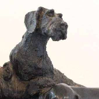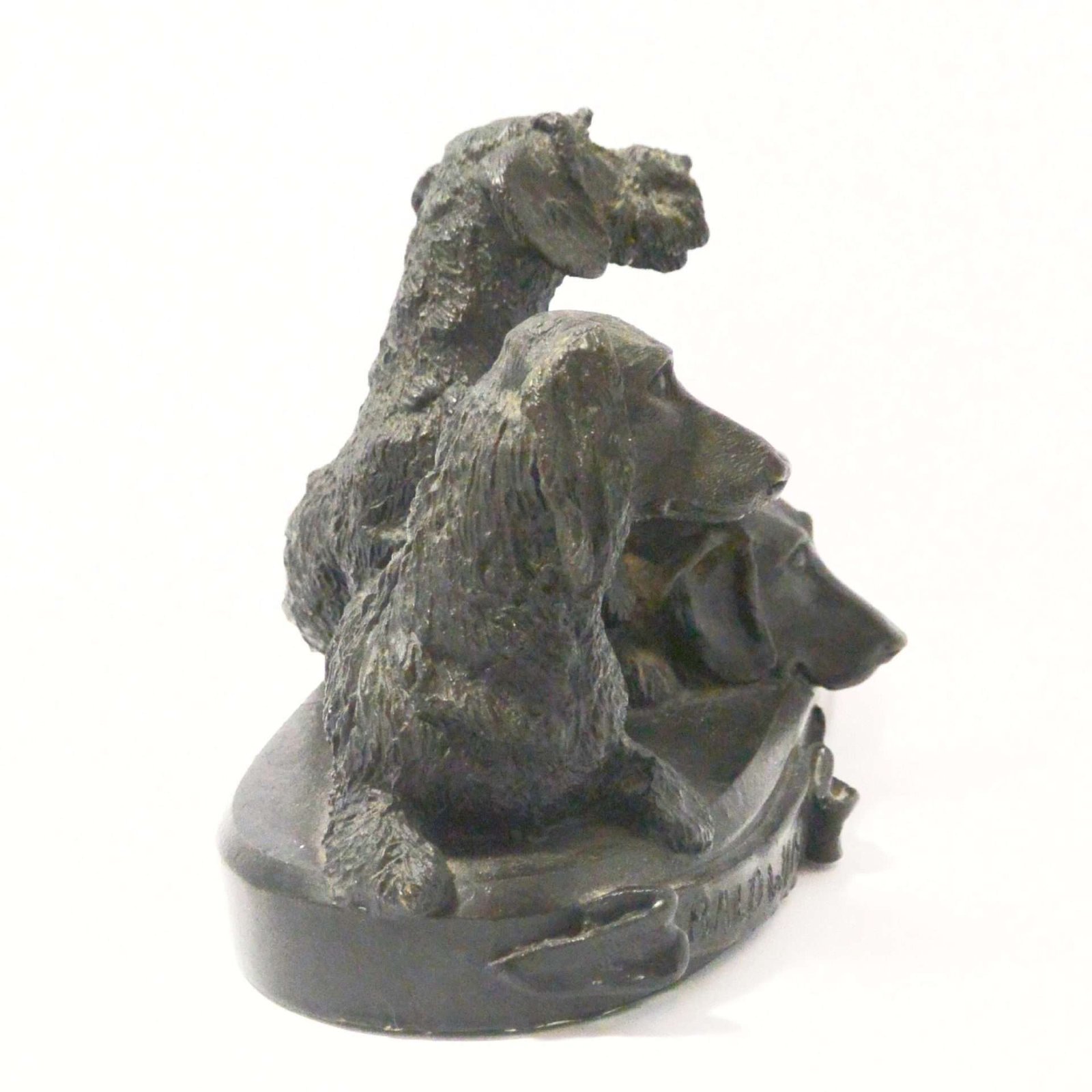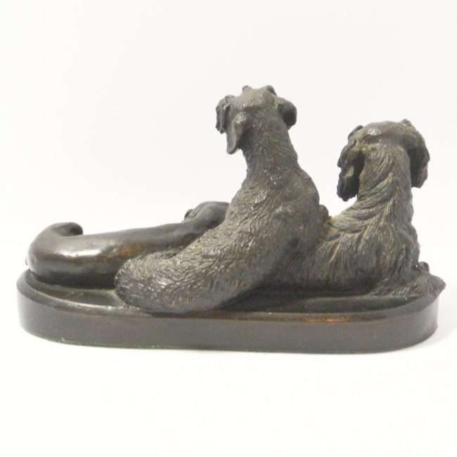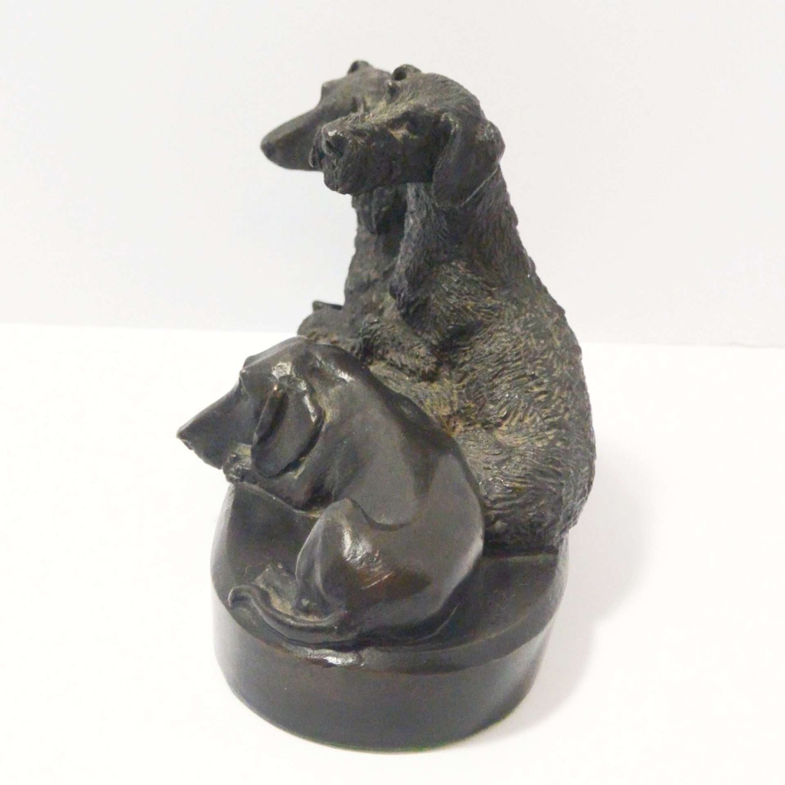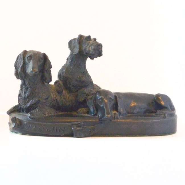 This elegant, bronze figurine features three Dachshund dogs: a Short-Haired Dachshund, a Wire-Haired Dachshund, and a Long-Haired Dachshund. Each one is reclining in a slightly different pose on a bronze base..