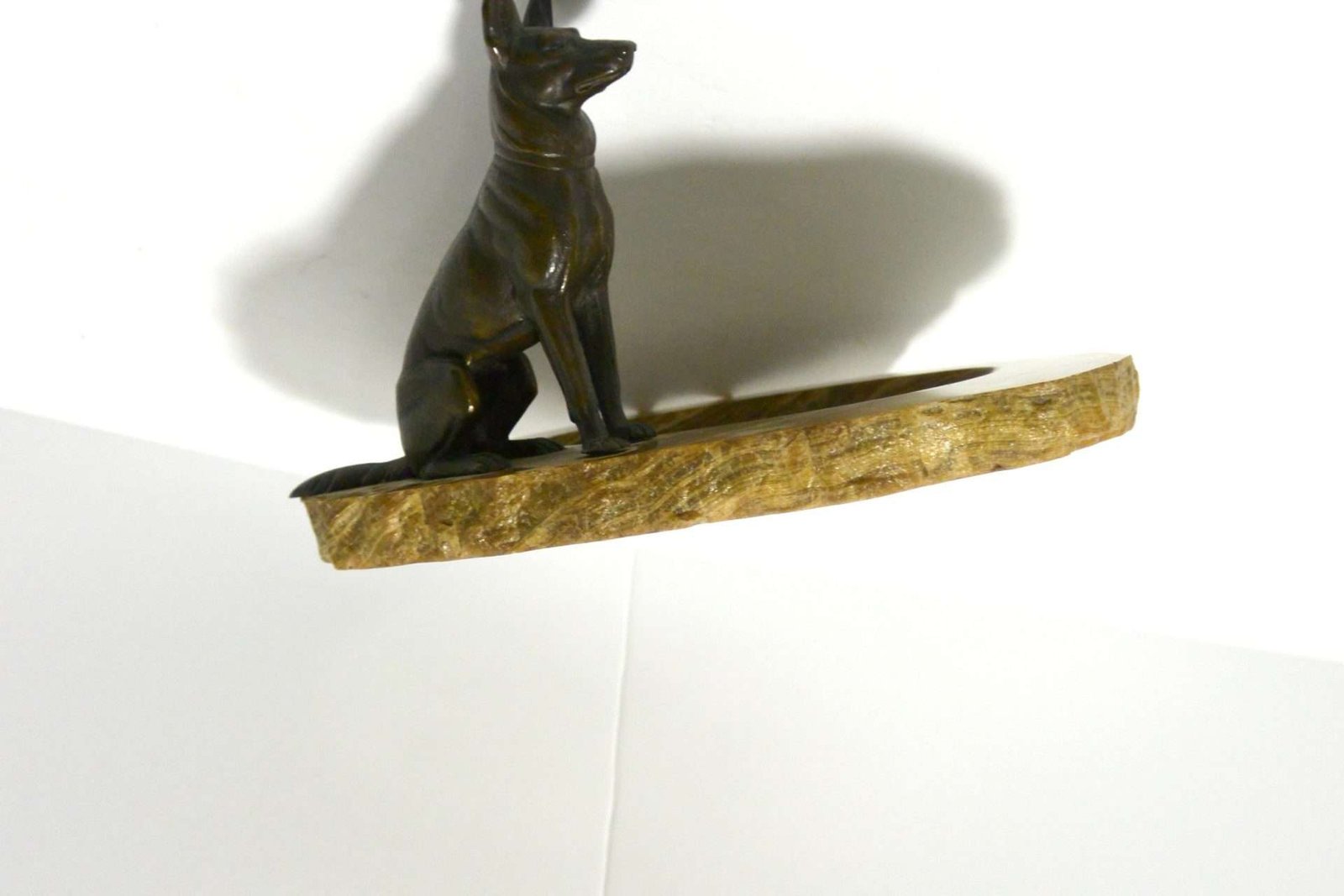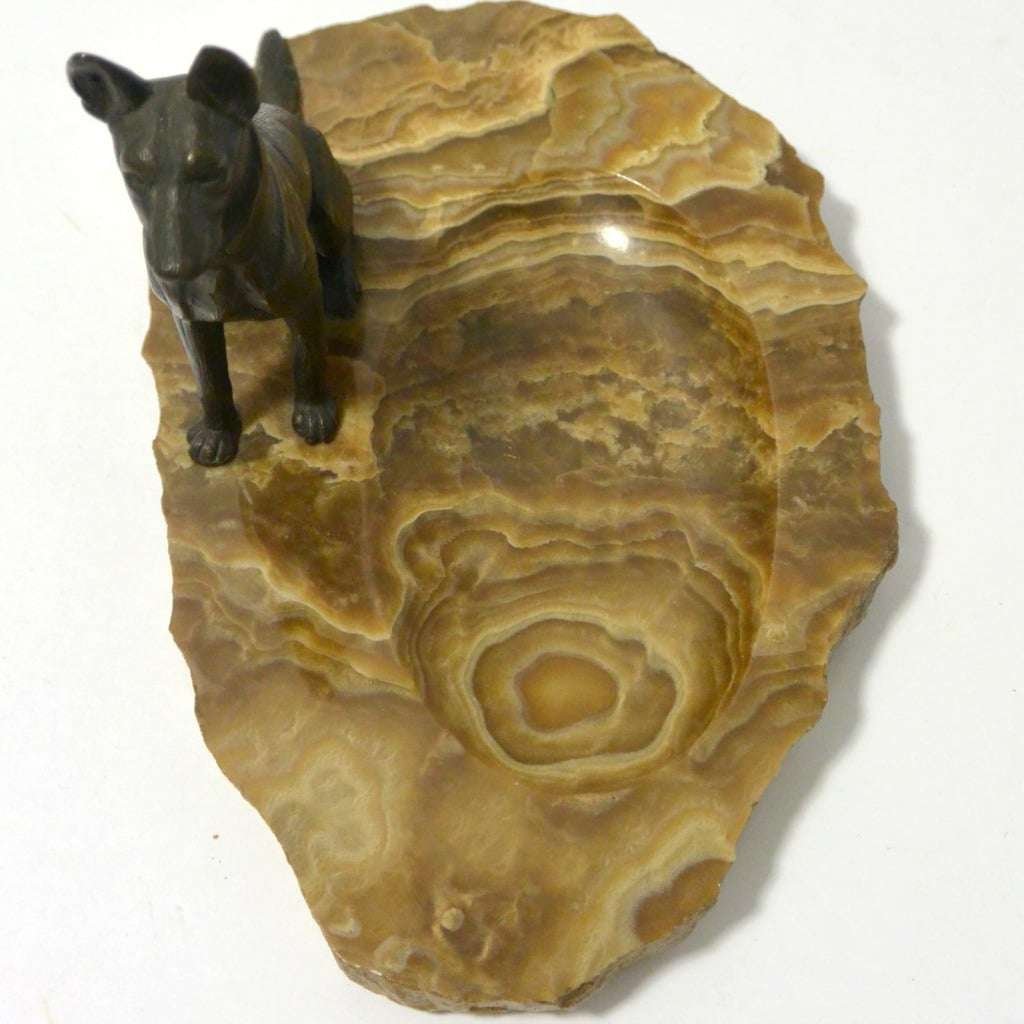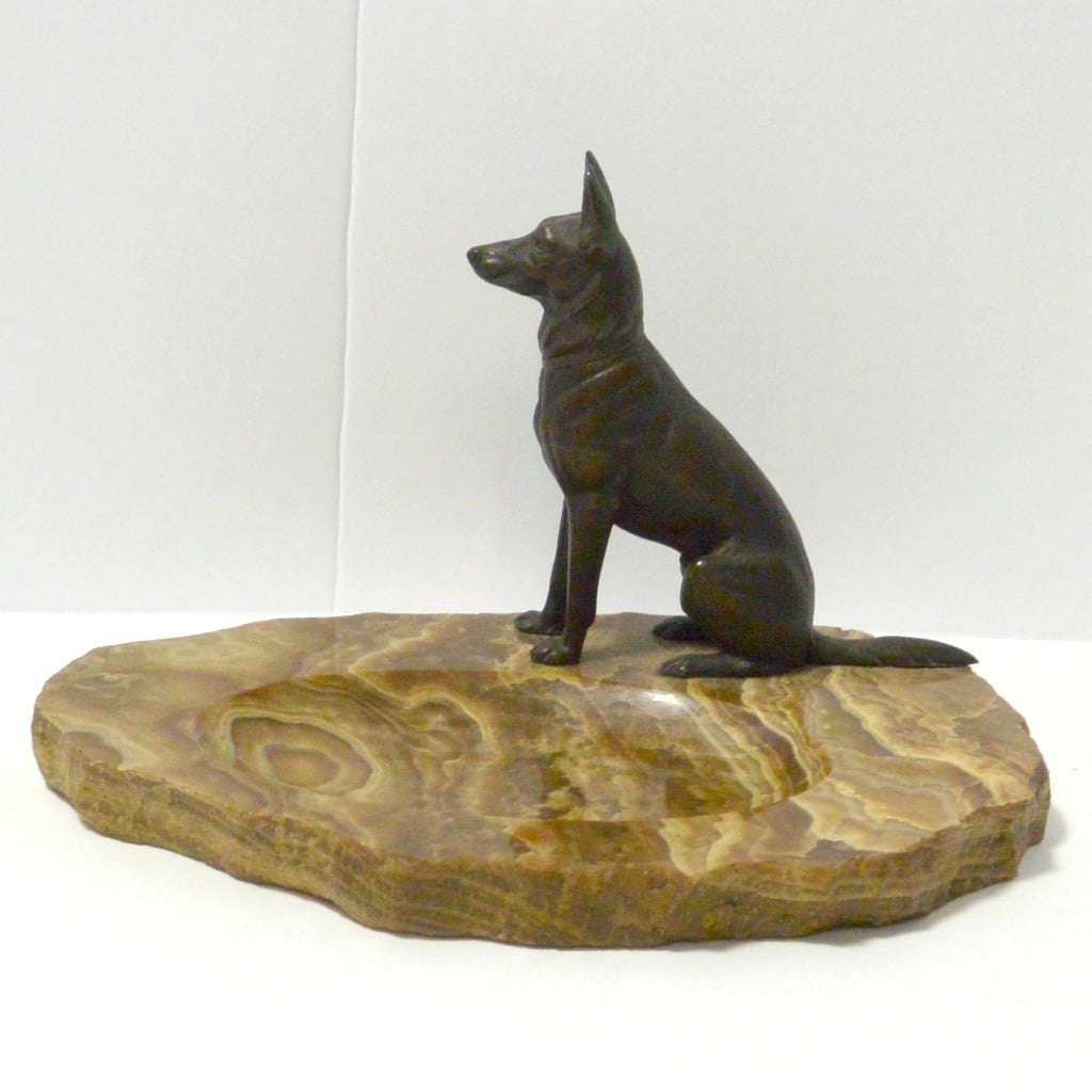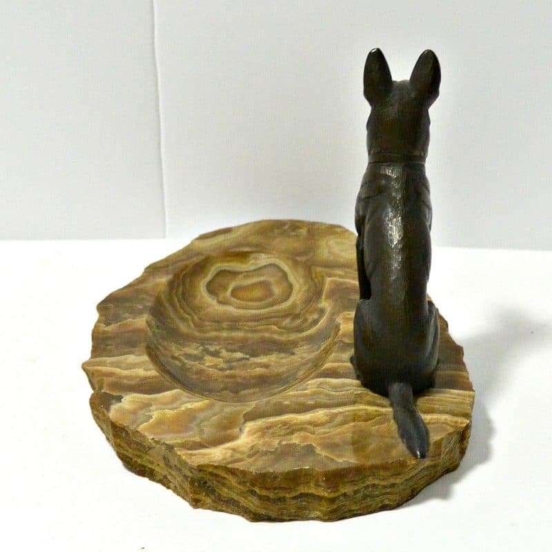 Sitting alert and proud, this bronze German Shepherd dog certainly looks like he takes his job, of guarding whatever is placed in this marble dish, seriously.