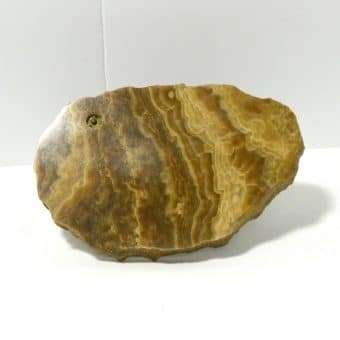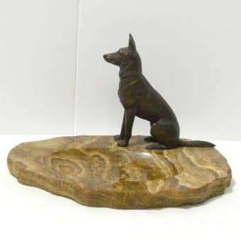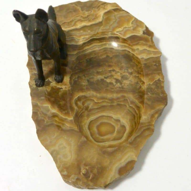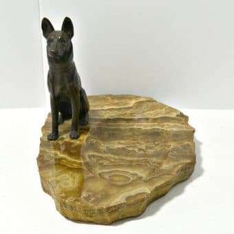 Sitting alert and proud, this bronze German Shepherd dog certainly looks like he takes his job, of guarding whatever is placed in this marble dish, seriously. He is 4″ tall x 3 1/2″ long x 1″ wide and sits on a gorgeous marble slab that is 7 1/2″ long x 5 1/4″ wide x 5/8″ thick. The slab is rough cut along the edges and has a wonderful rainbow of cream to tan to soft brown coloring. It has a natural “bowl” in the center that is 4 3/4″ long x 2 3/4″ wide. It is the perfect size to hold keys, coins, cufflinks or even paper clips and stamps on a desk. The entire piece is in excellent condition.