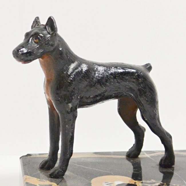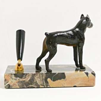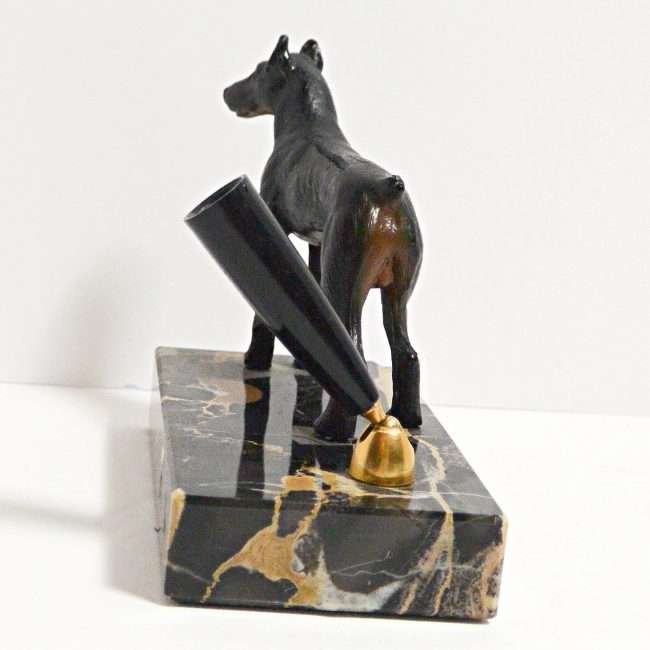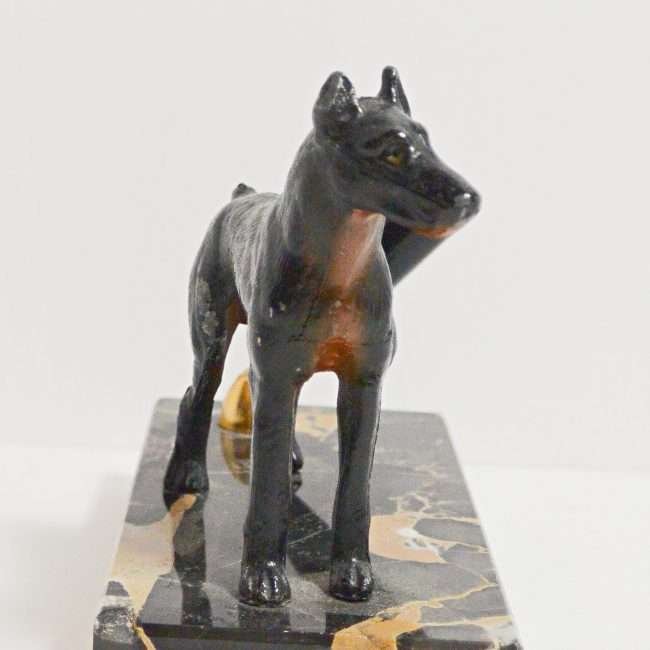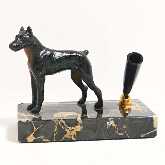 This cold-painted bronze Doberman Pinscher dog is the centerpiece of this vintage pen holder.