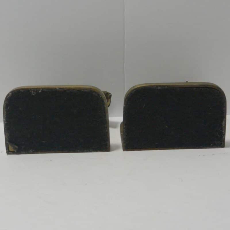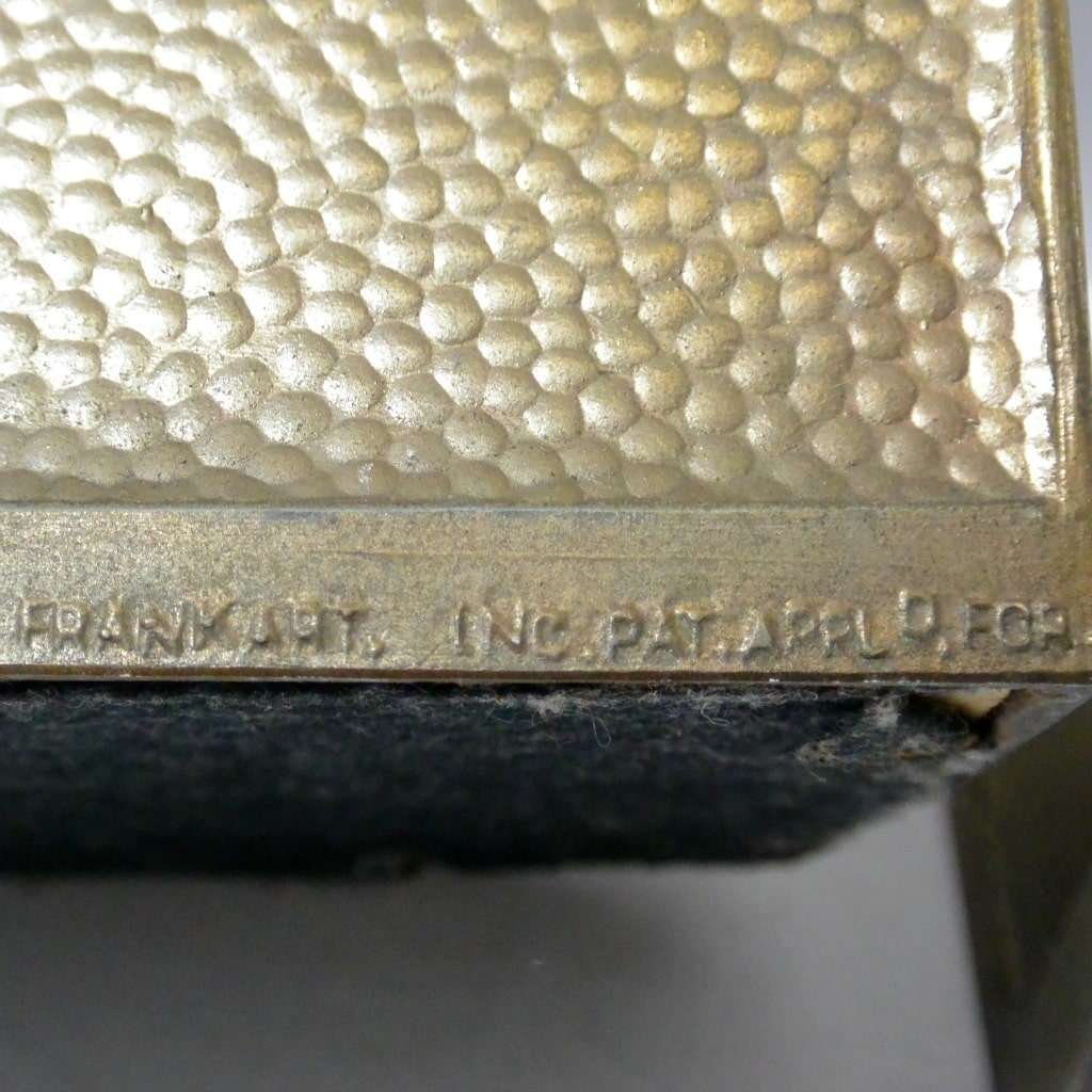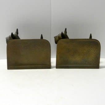 This very Art Deco pair of Scottish Terrier figurines are bookends. Their understated simplicity and elegance are true to the style of those made by Frankart during the 1920’s through the 1930’s. They measure 5″ tall x 5 1/2″ long x 3 1/2″ wide, and they are in excellent condition. They are made of a heavy metal with a wonderful bronze patina. They are each stamped “Frankart, Inc. Pat Applied for.”