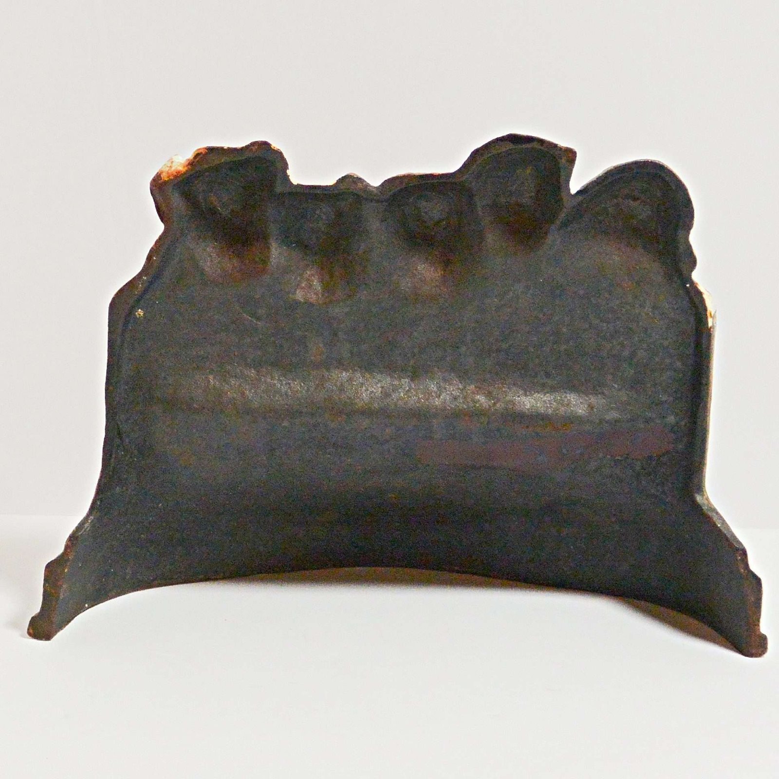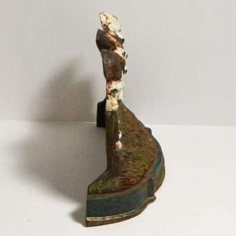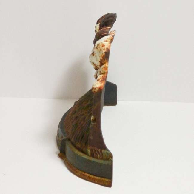 This vintage doorstop, which is 9″ tall x 11 3/4″ long x 2 1/2″ wide, is quite heavy and stable enough to use against a heavy door.