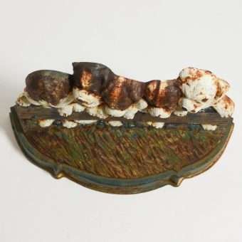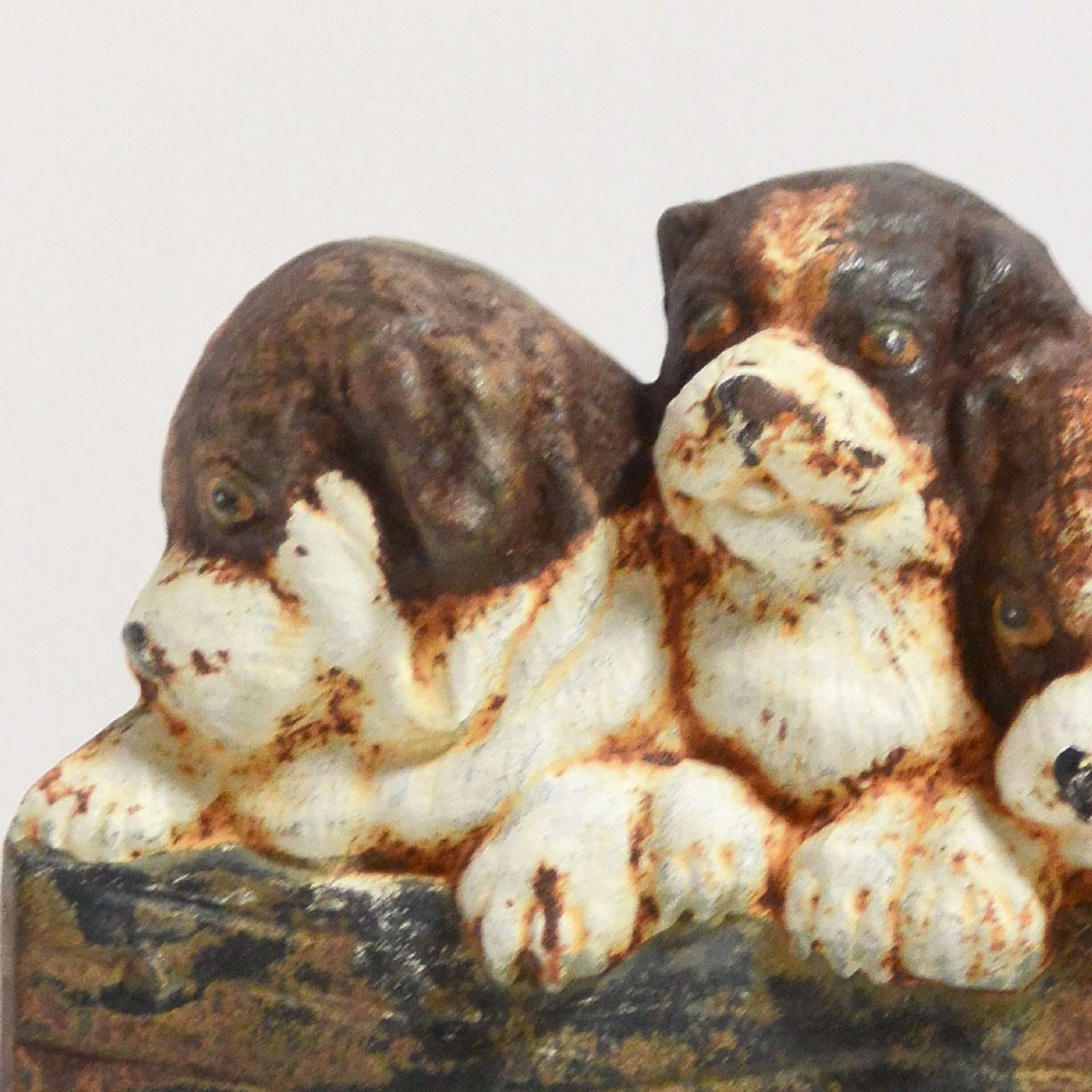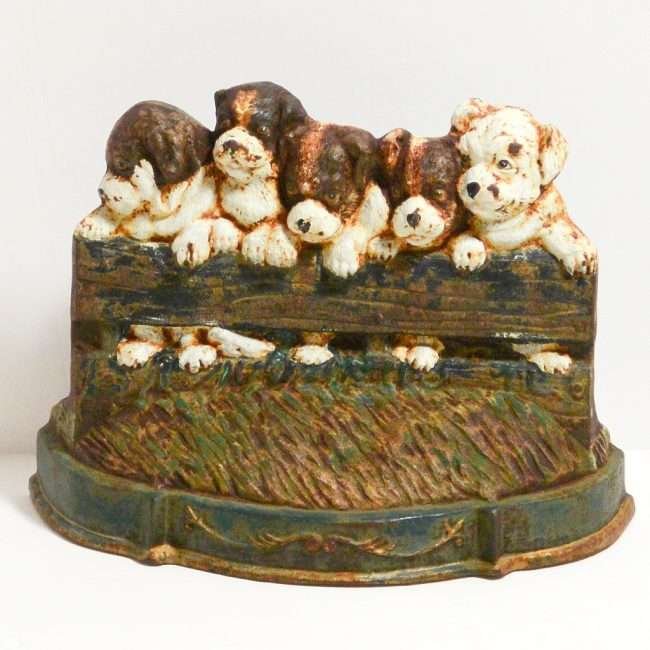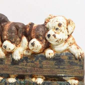 This charming, cast iron doorstop features five puppy dogs looking over the side of a wooden crate.