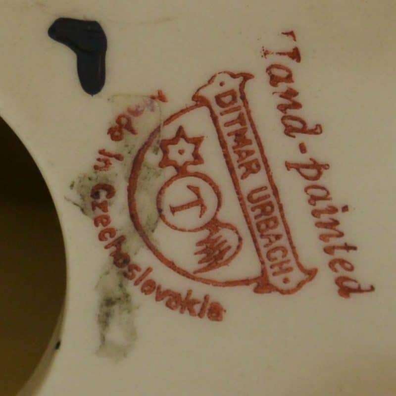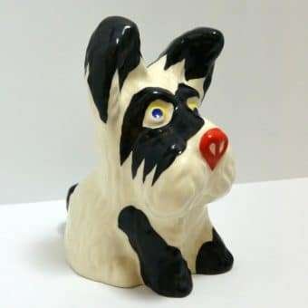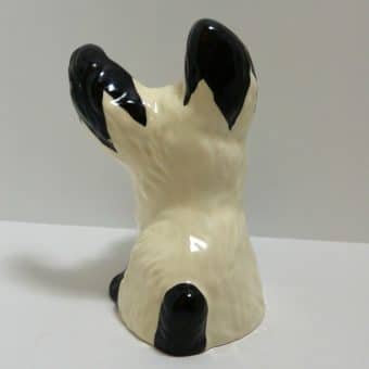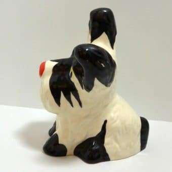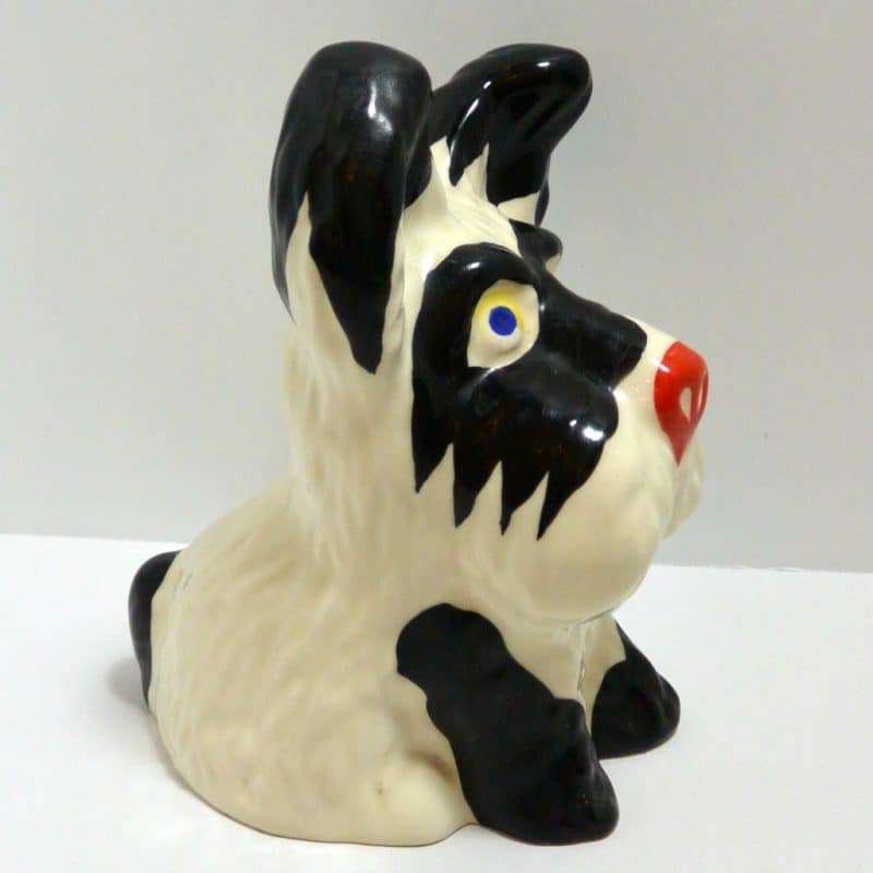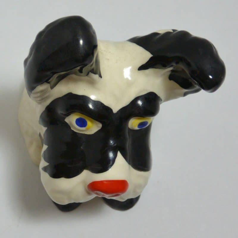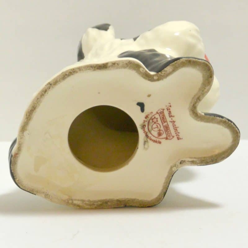 This hand painted Ditmar Urbach dog in black on white, with a touch of red, bright blue and yellow, is not only stunning, it is quite rare. It appears to be a unique cross between a Scottish Terrier and a West Highland Terrier, both being quite popular breeds during the 1920’s ” “ 1930’s. This figurine, also dating from the 1920’s to the 1930’s, is stamped “Handpainted Erphila Czechoslovakia”.