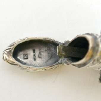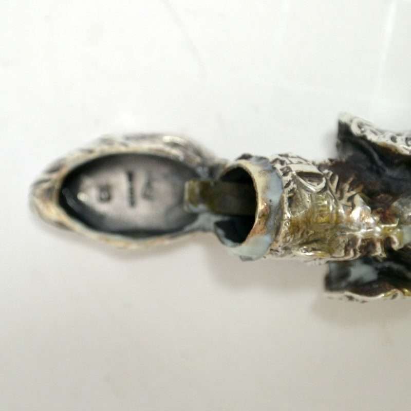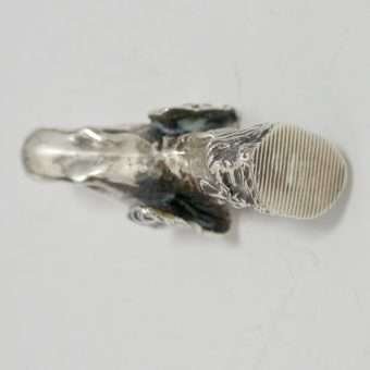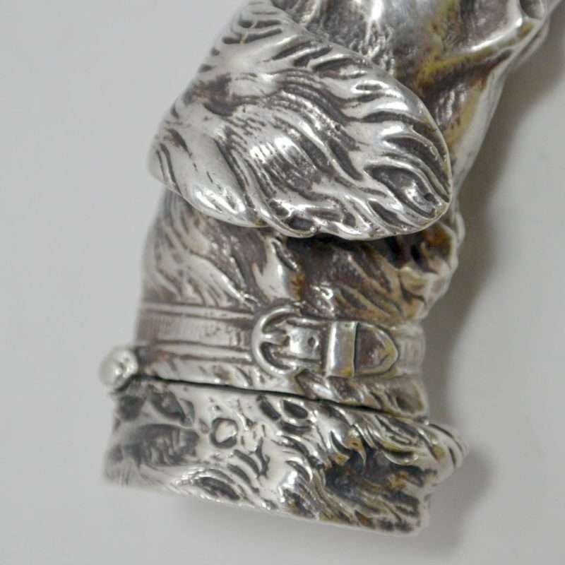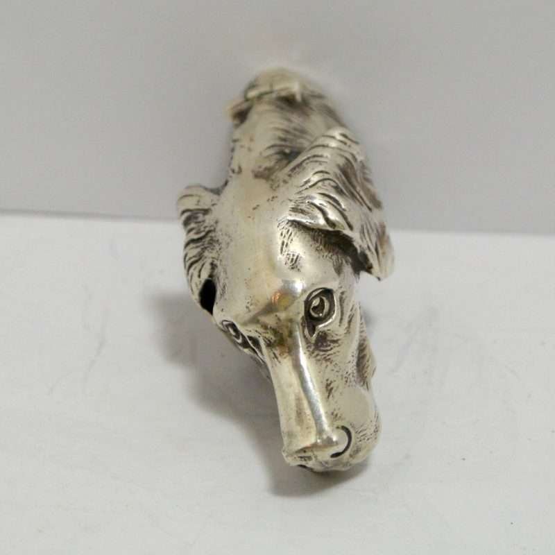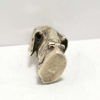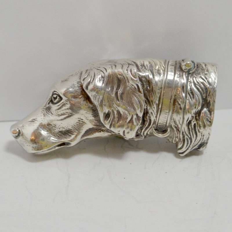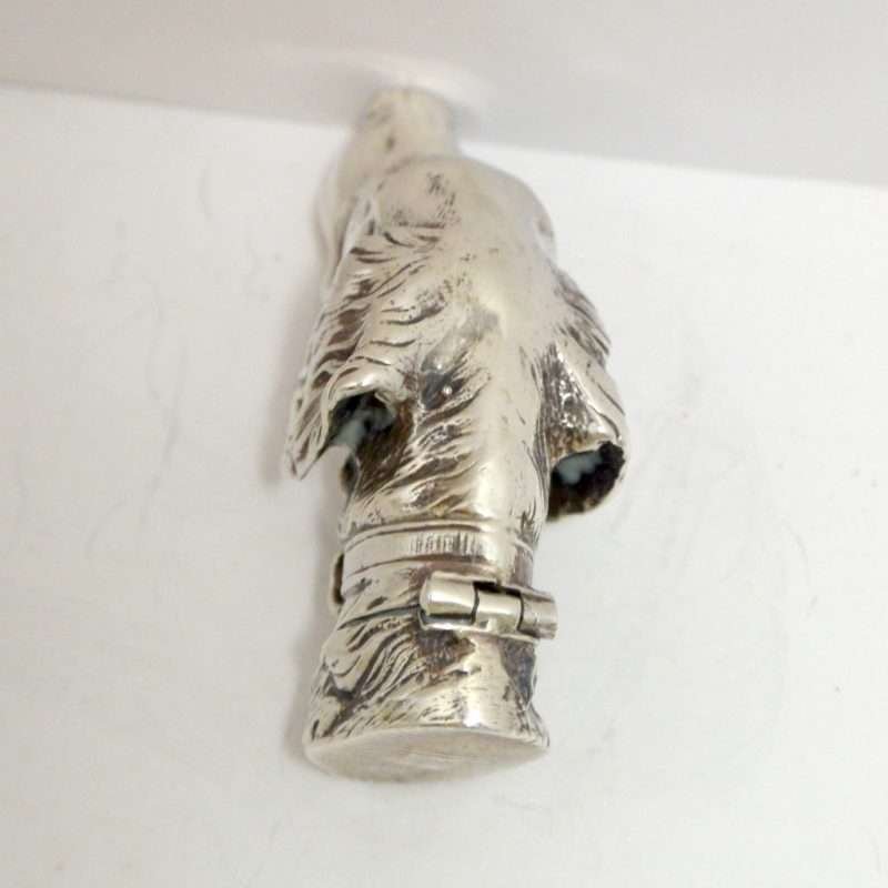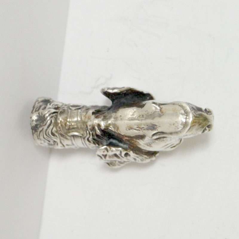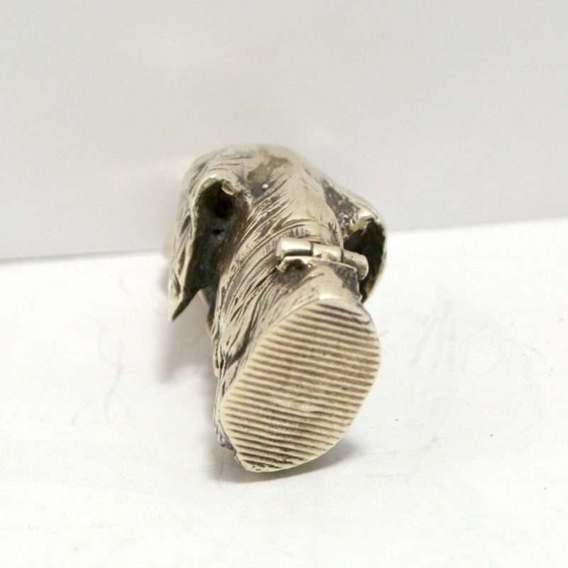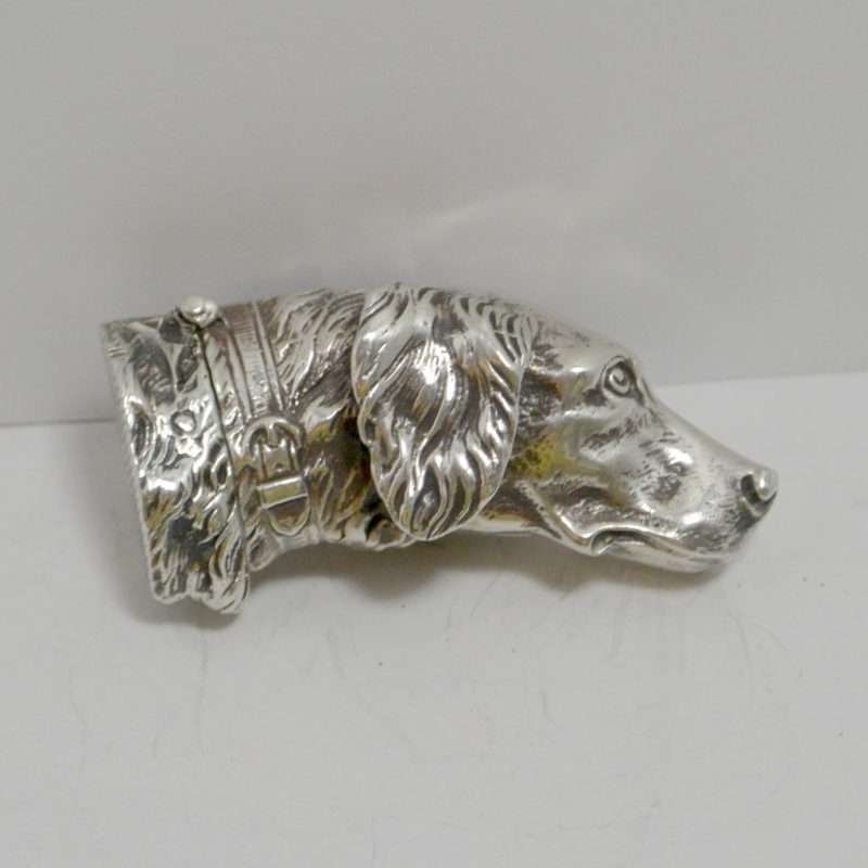 This sterling silver dog head vesta case is exquisite in every way. The detailing on this Retriever dog includes an abundance of fur lines, life-like eyes, nose and muzzle, and an intricately designed collar and buckle. It is also in excellent condition with a striker lid that opens well and snaps shut tightly. The maker’s letters “ES” are inside the flip lid. Measuring 2″ long x 1″ tall x 1/4″ wide, it weighs in at 44.1 grams of sterling silver. If you are a collector of vesta cases, this gorgeous dog would be an extraordinary addition to your collection. For a dog lover, this beautiful work of canine art would be a gift to treasure forever!