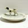 Both are in excellent condition. The reclining dog measures 7 1/2″ long x 3 3/4″ tall x 2 1/2″ wide. The seated dog measures 4″ long x 4 1/2″ tall x 3 1/2″ wide. You can find these fabulous figurines on page 7 of “Glass Animals of the Depression Era” by Dick Spencer.