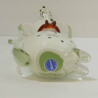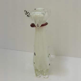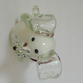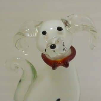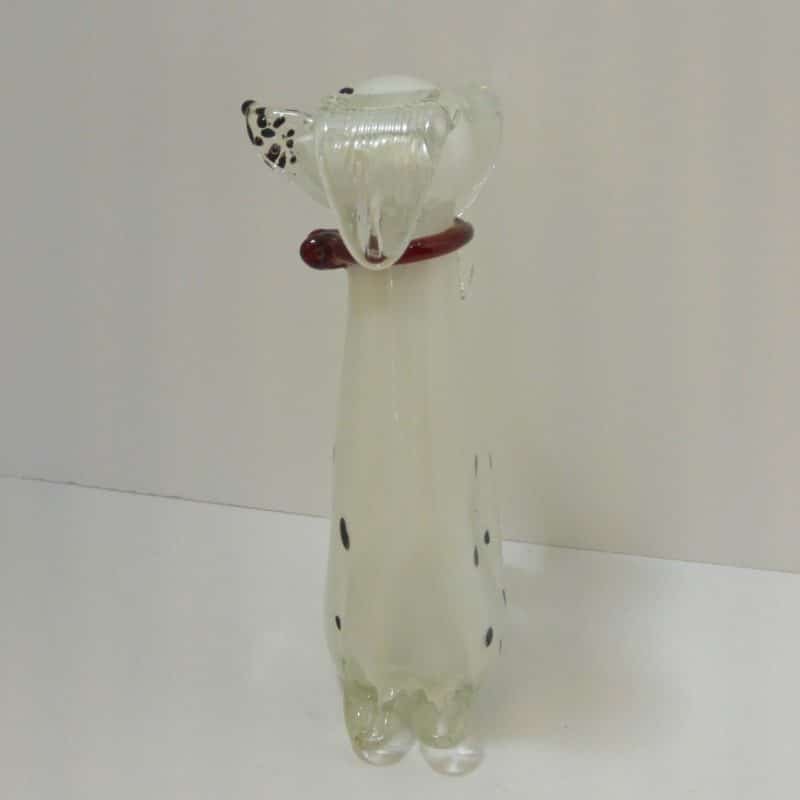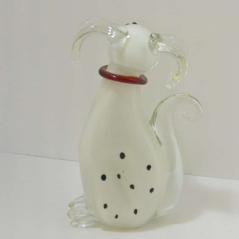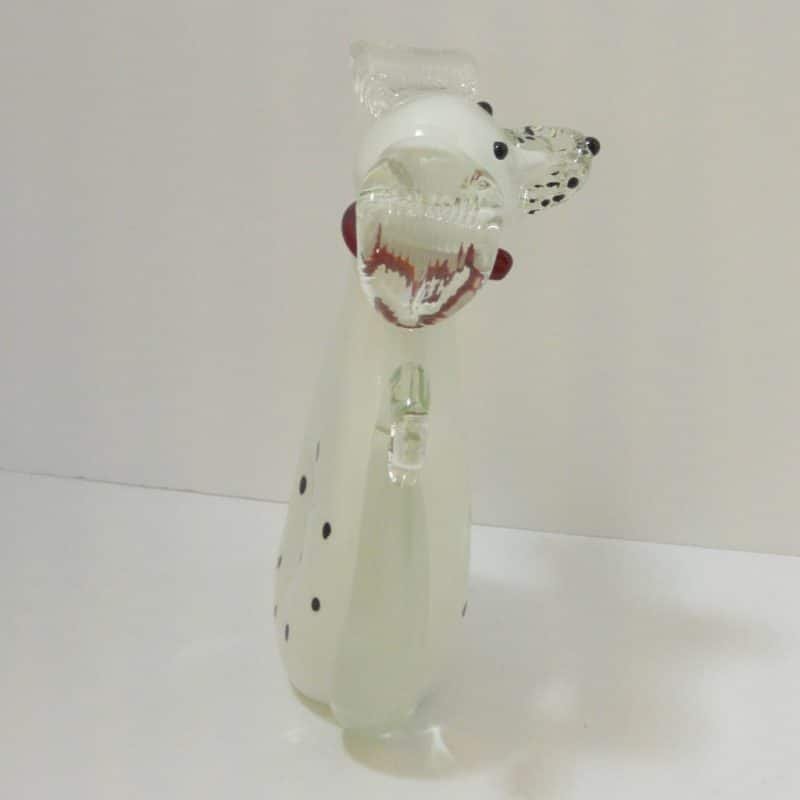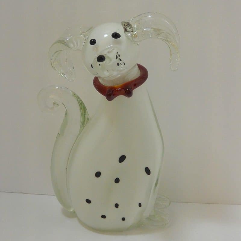 This handmade, art glass Dalmatian dog is both fun and useful. He is a joy to look at, with his clear glass covering a white glass body white bright black spots, and clear glass tail and ears. He also has marvelous detailing with a spotted muzzle, and a deep red glass collar with a perky bow tie. Anyone who has ever befriended a Dalmation knows what exuberant clowns they can be, and this figurine captures that personality to perfection with its curled tail, floppy ears and that “full body wiggle” you can expect from a Dalmatian waiting for a treat.