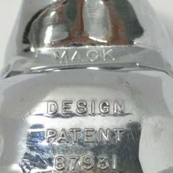 It is stamped “MACK” on the Bulldog’s collar just under his chin, and it is stamped “Design Patent 87931” on his chest.