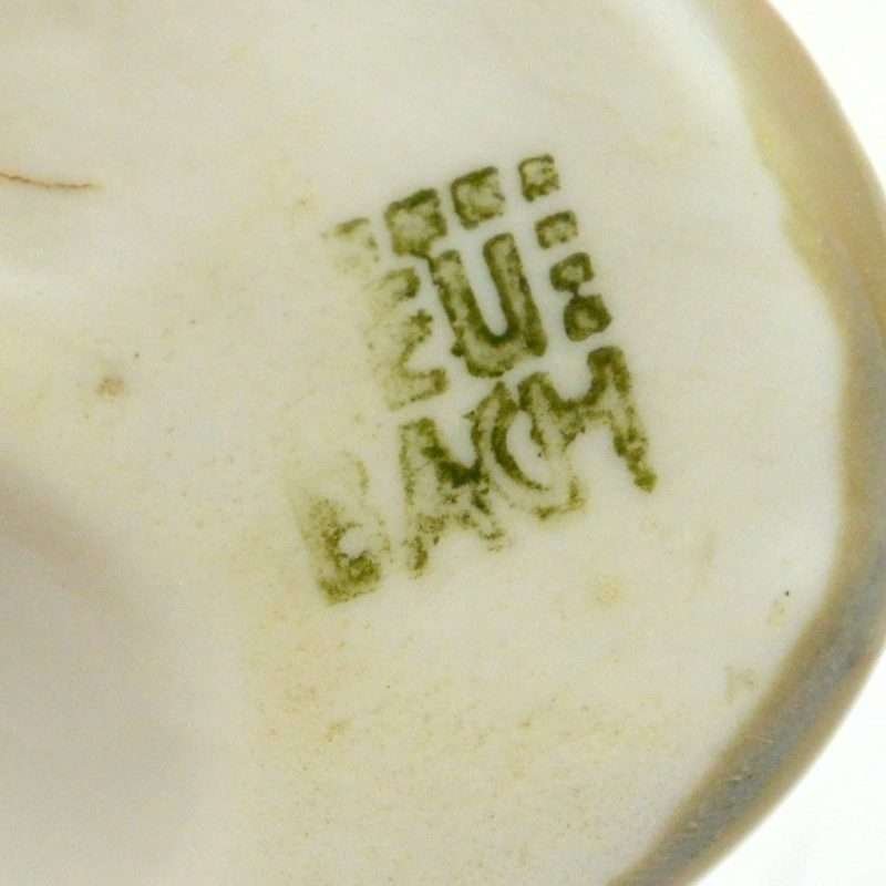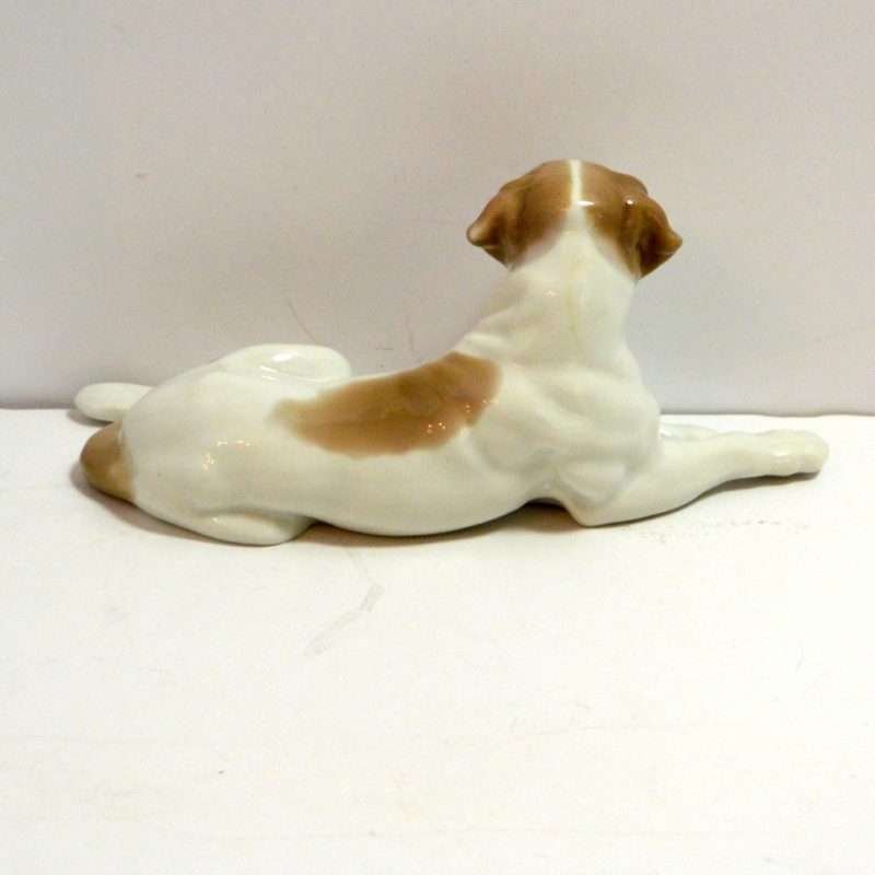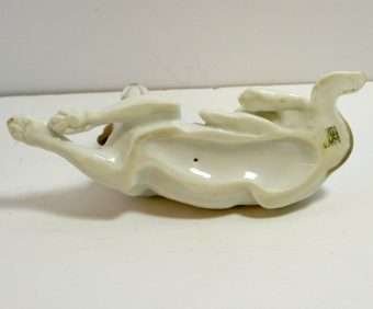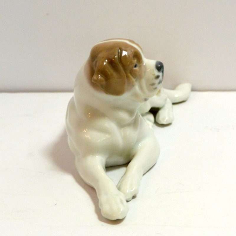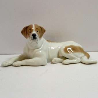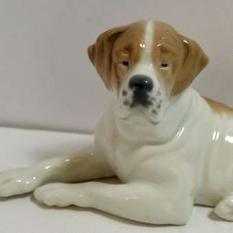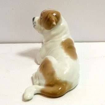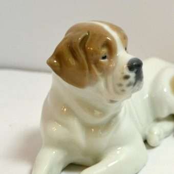 This porcelain St. Bernard dog created by Gebruder Heubach, the well-known dollmakers of Thuringia Germany, looks every bit the “gentle giant”. The lifelike detailing shows everything from the furrow in his brow to the pads on the undersides of his paws! Reclining at 3″ tall x 7 1/4″ long x 2 1/2″ wide, he is done in a snowy white with soft tan marking , a soft grey nose, and a beautiful, high-gloss finish. He is in excellent condition, and he is an exquisite example of the Heubach figurines of the early 20th century with the green Heubach factory mark stamped on his underside. This elegant St. Bernard dog figurine is truly a rare and unique find, and an extraordinary addition to any canine porcelain collection. If you are an owner or breeder of this wonderful dog, this figurine is a “must-have.”